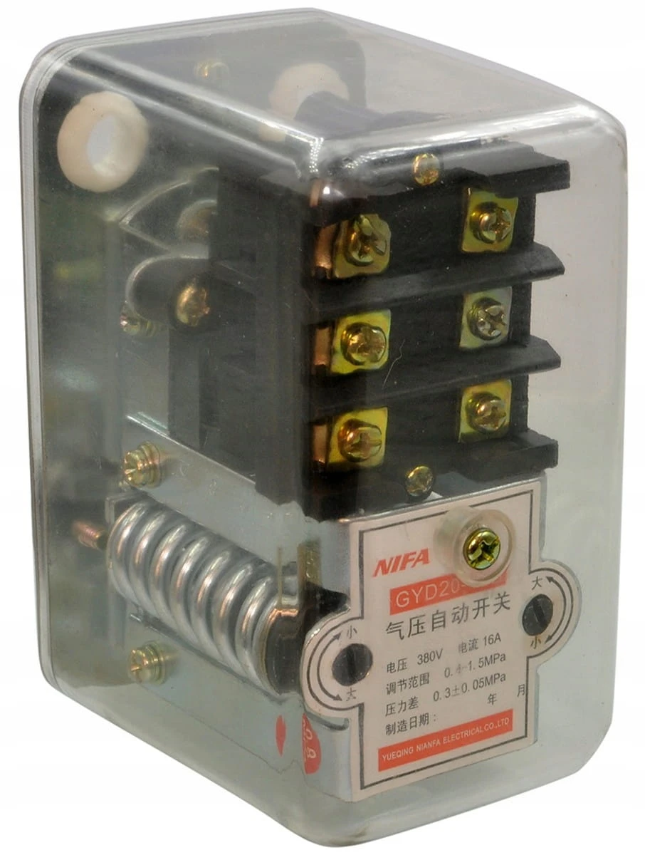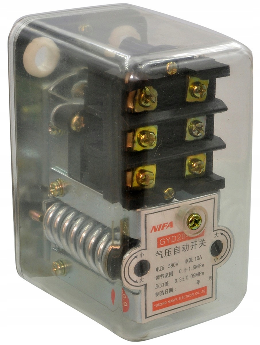 Automatyka stosowana w sprężarkach trójfazowych zasilanych napięciem 380 V. Umożliwia automatyczne sterowanie pracą sprężarki — włącza ją przy spadku ciśnienia i wyłącza po osiągnięciu zadanej wartości. Transparentna obudowa ułatwia kontrolę działania. Przeznaczona do układów z jednym wyjściem powietrza i przyłączem M 3 8 cala.
