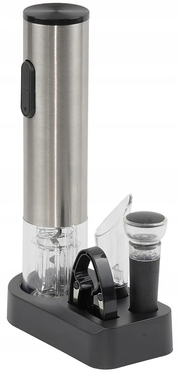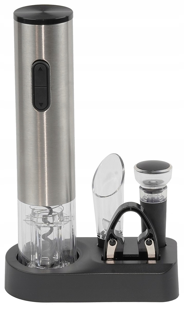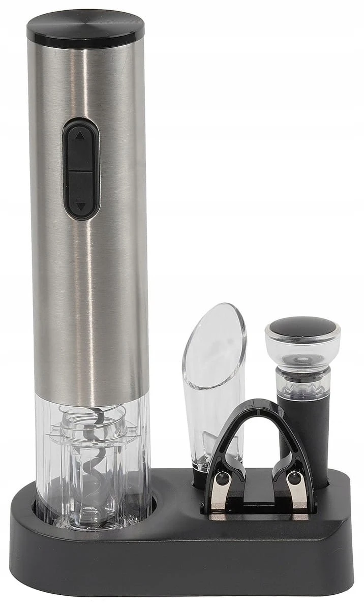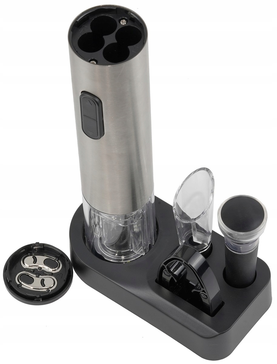 - Elektryczny korkociąg – umożliwia szybkie i bezwysiłkowe otwieranie butelek wina. Zasilany bateriami, co gwarantuje pełną mobilność.