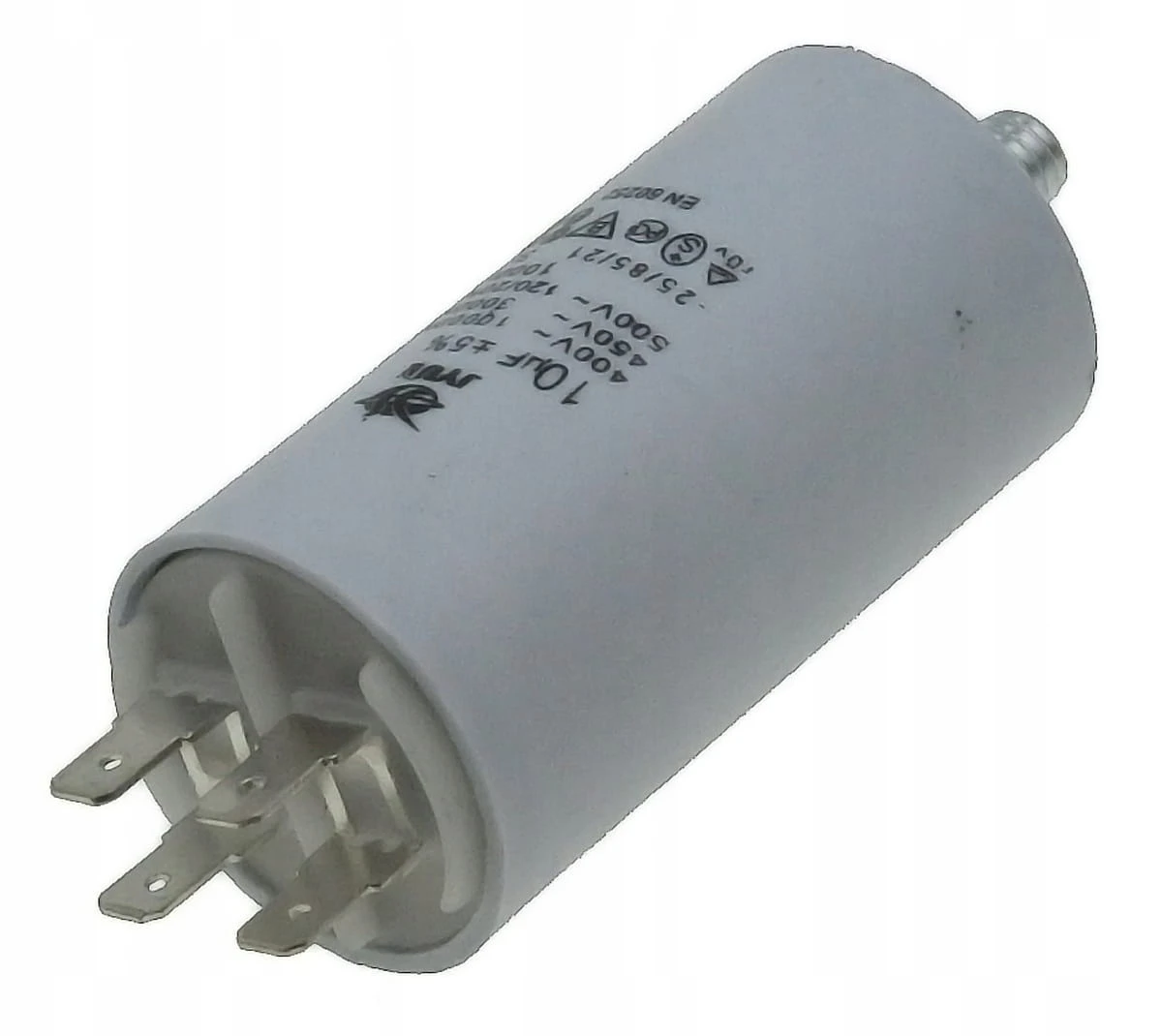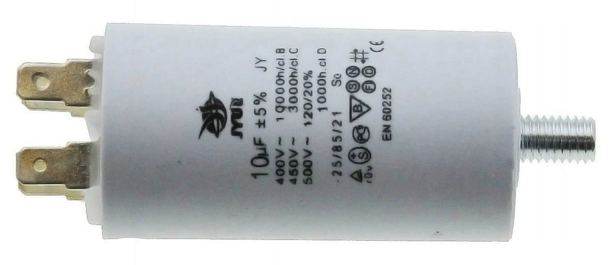 Kondensator rozruchowy JYUL o pojemności 10 µF i napięciu znamionowym 450 VAC. Wyposażony w mocowanie śrubowe oraz zaciski, co ułatwia instalację. Idealny do zastosowań w silnikach jednofazowych oraz innych urządzeniach wymagających wsparcia przy rozruchu.