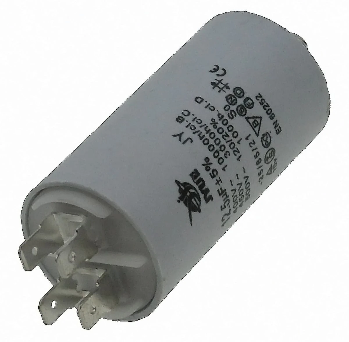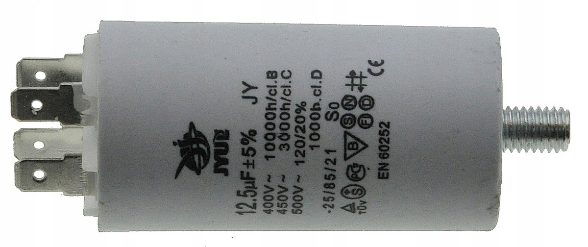 Kondensator rozruchowy JYUL o pojemności 12,5 µF i napięciu znamionowym 450 VAC. Wyposażony w mocowanie śrubowe oraz zaciski, co ułatwia instalację. Idealny do zastosowań w silnikach jednofazowych oraz innych urządzeniach wymagających wsparcia przy rozruchu.