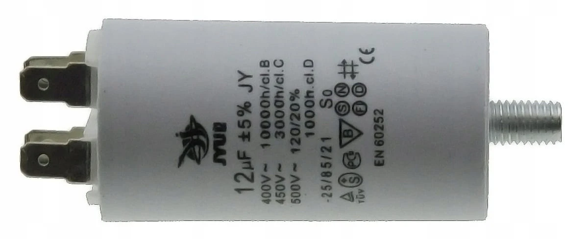 Kondensator rozruchowy JYUL o pojemności 12 µF i napięciu znamionowym 450 VAC. Wyposażony w mocowanie śrubowe oraz zaciski, co ułatwia instalację. Idealny do zastosowań w silnikach jednofazowych oraz innych urządzeniach wymagających wsparcia przy rozruchu.