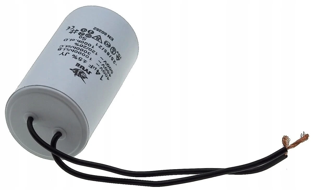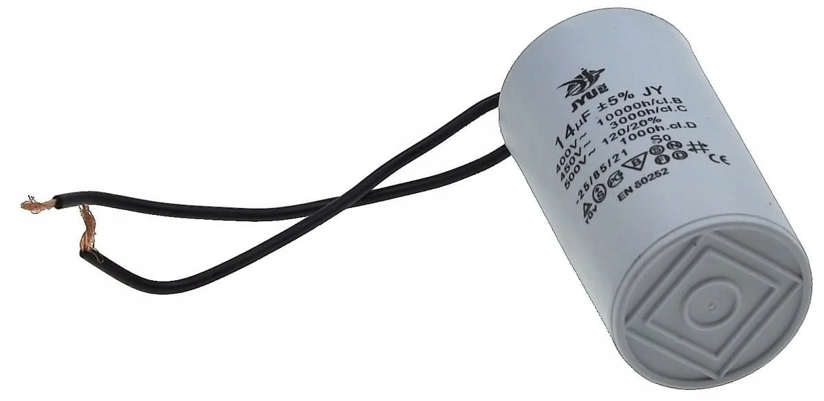 Kondensator rozruchowy JYUL o pojemności 14 µF i napięciu znamionowym 450 VAC. Wyposażony w przewody o długości 40/72 mm, co ułatwia instalację. Idealny do zastosowań w silnikach elektrycznych oraz innych urządzeniach wymagających wsparcia przy rozruchu.