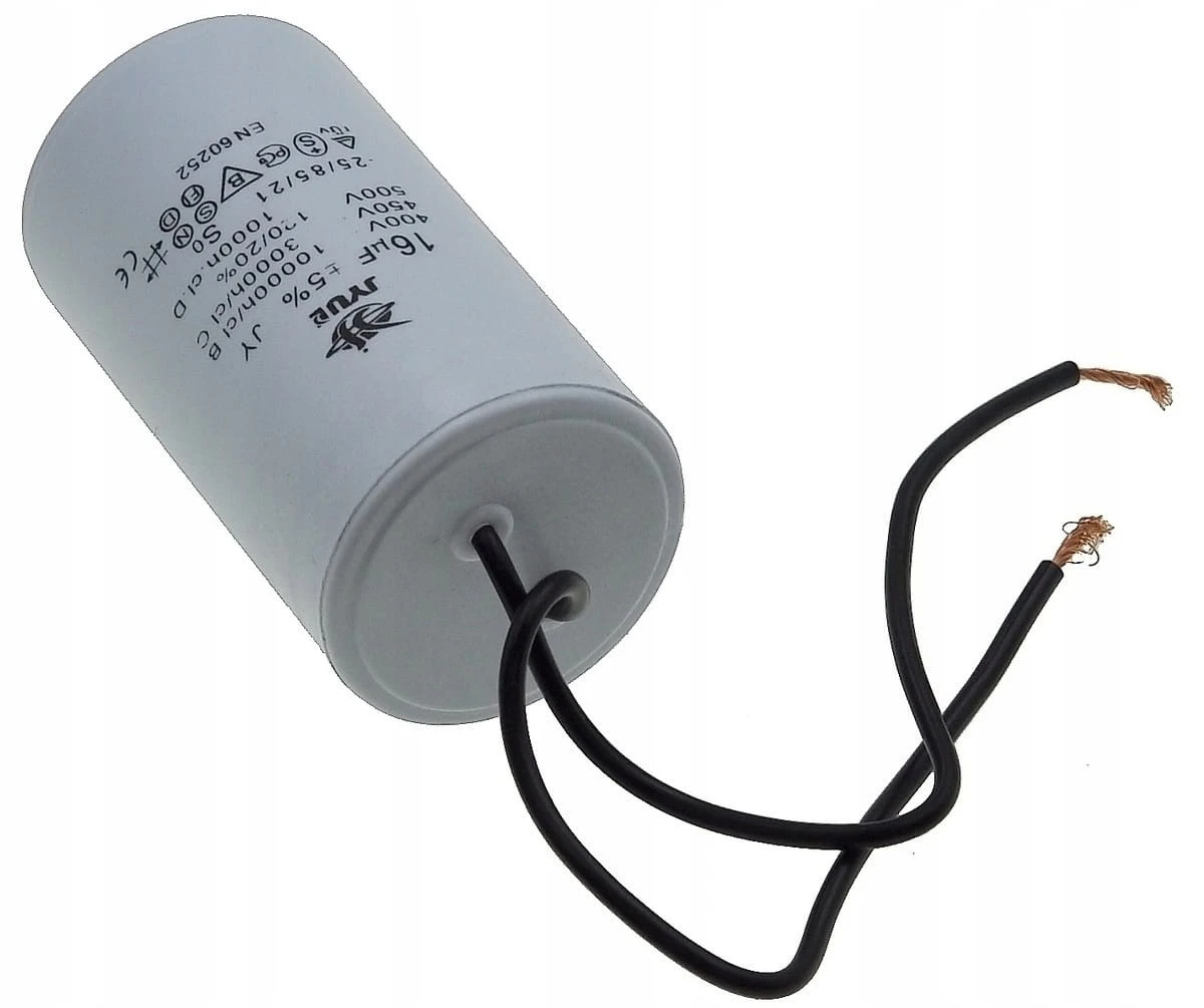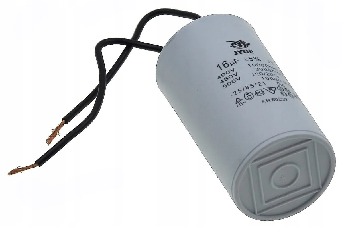 Kondensator rozruchowy JYUL o pojemności 16 µF i napięciu znamionowym 450 VAC. Wyposażony w przewody o długości 40/72 mm, co ułatwia instalację. Idealny do zastosowań w silnikach elektrycznych oraz innych urządzeniach wymagających wsparcia przy rozruchu.