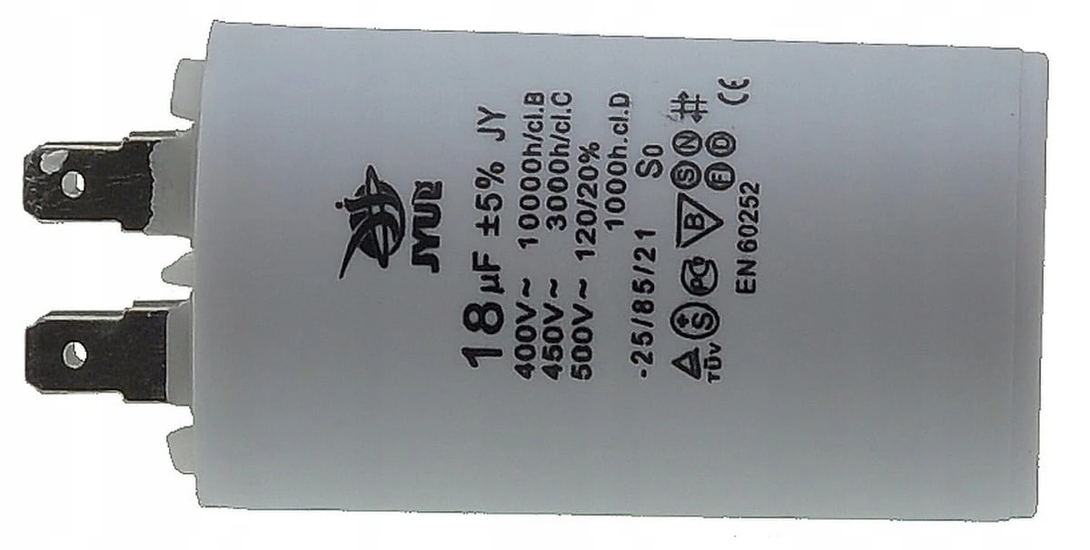 Kondensator JYUL o pojemności 18 µF i napięciu znamionowym 450 VAC. Wyposażony w zaciski, co ułatwia instalację. Idealny do zastosowań w różnych urządzeniach elektrycznych wymagających takiej pojemności.