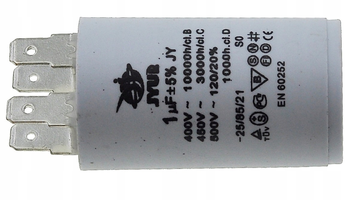 Kondensator JYUL o pojemności 1 µF i napięciu znamionowym 450 VAC. Wyposażony w zaciski, co ułatwia instalację. Idealny do zastosowań w różnych urządzeniach elektrycznych wymagających takiej pojemności.