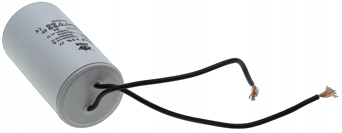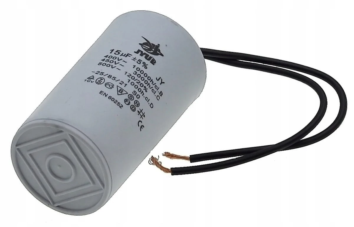 Kondensator rozruchowy JYUL o pojemności 20 µF i napięciu znamionowym 400 VAC. Wyposażony w przewody o długości 40/72 mm, co ułatwia instalację. Idealny do zastosowań w silnikach elektrycznych oraz innych urządzeniach wymagających wsparcia przy rozruchu.