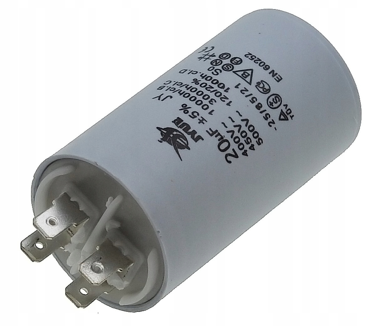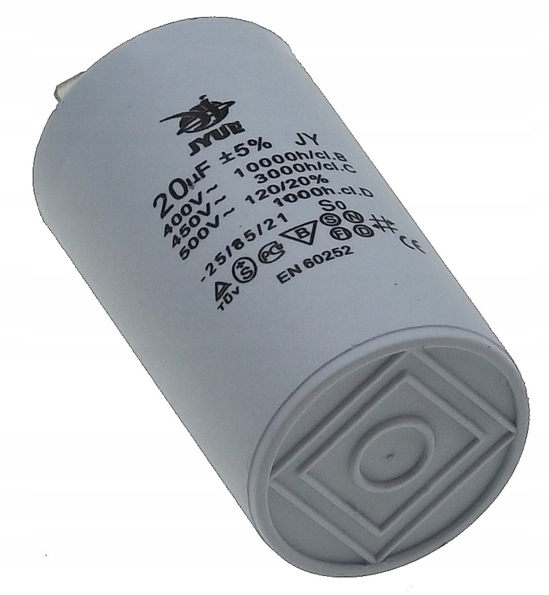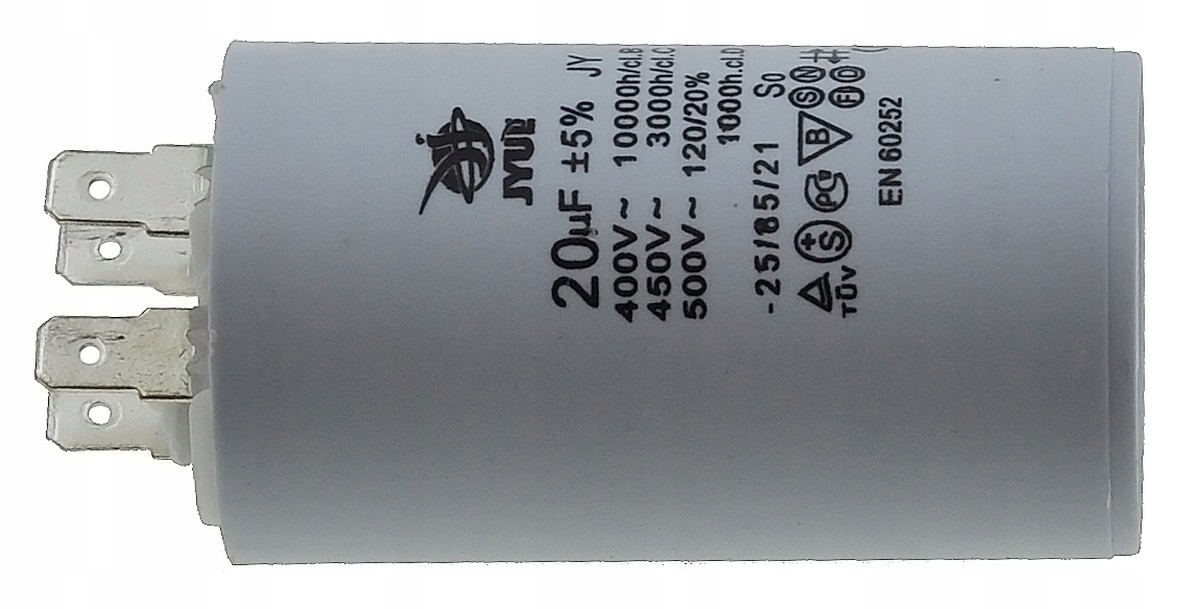 Kondensator JYUL o pojemności 20 µF i napięciu znamionowym 450 VAC. Wyposażony w zaciski, co ułatwia instalację. Idealny do zastosowań w różnych urządzeniach elektrycznych wymagających takiej pojemności.