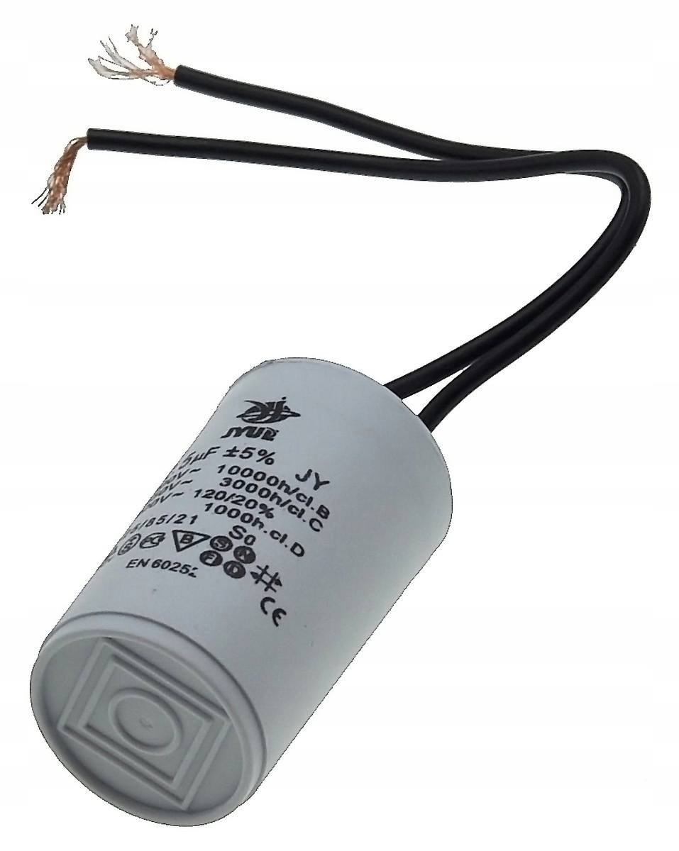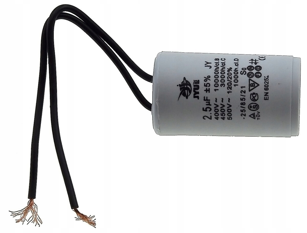 Kondensator rozruchowy JYUL o pojemności 25 µF i napięciu znamionowym 450 VAC. Wyposażony w przewody o długości 30-53 mm, co ułatwia instalację. Idealny do zastosowań w silnikach elektrycznych oraz innych urządzeniach wymagających wsparcia przy rozruchu.
