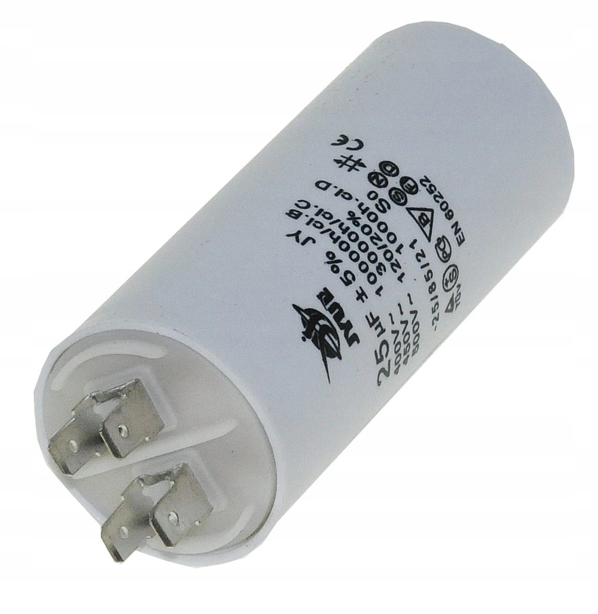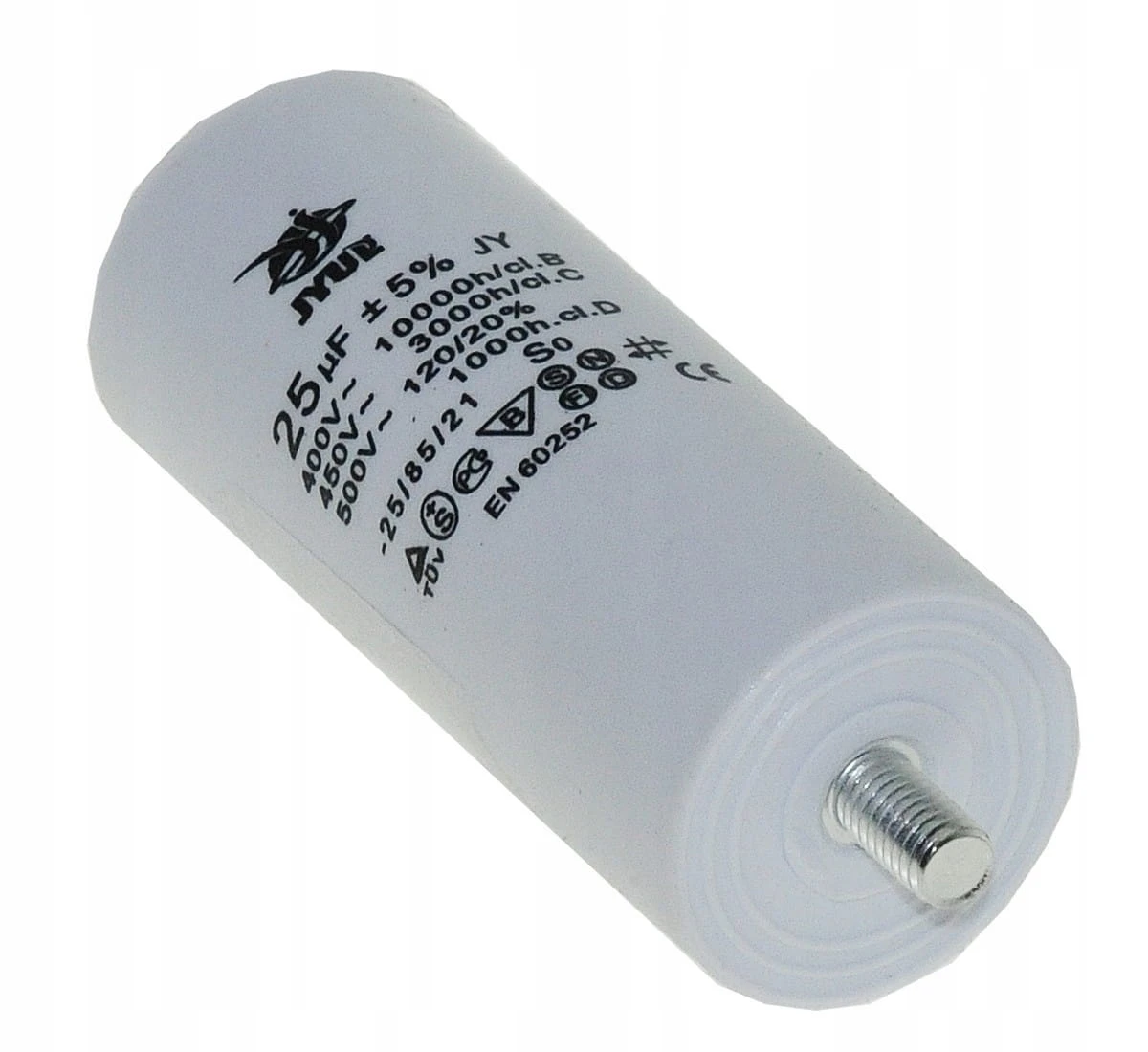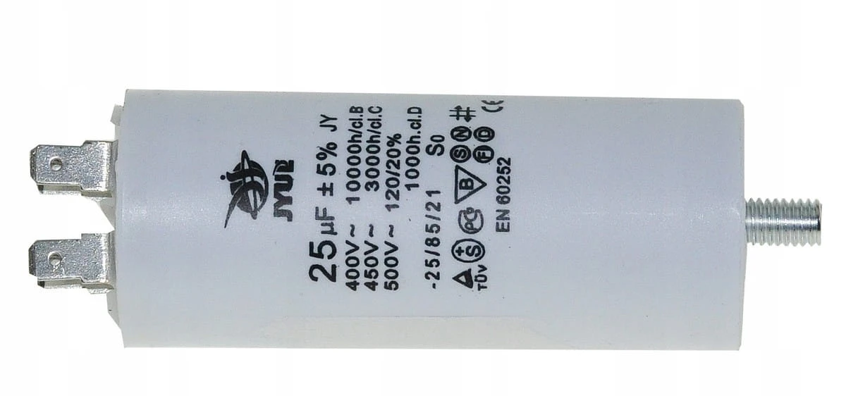 Kondensator rozruchowy JYUL o pojemności 25 µF i napięciu znamionowym 450 VAC. Wyposażony w mocowanie śrubowe oraz zaciski, co ułatwia instalację. Idealny do zastosowań w silnikach jednofazowych oraz innych urządzeniach wymagających wsparcia przy rozruchu.
