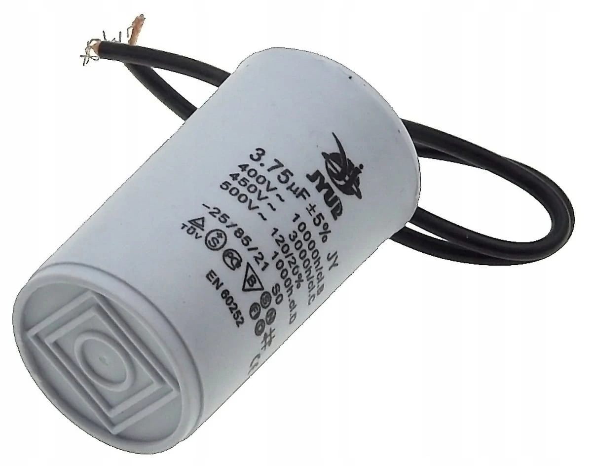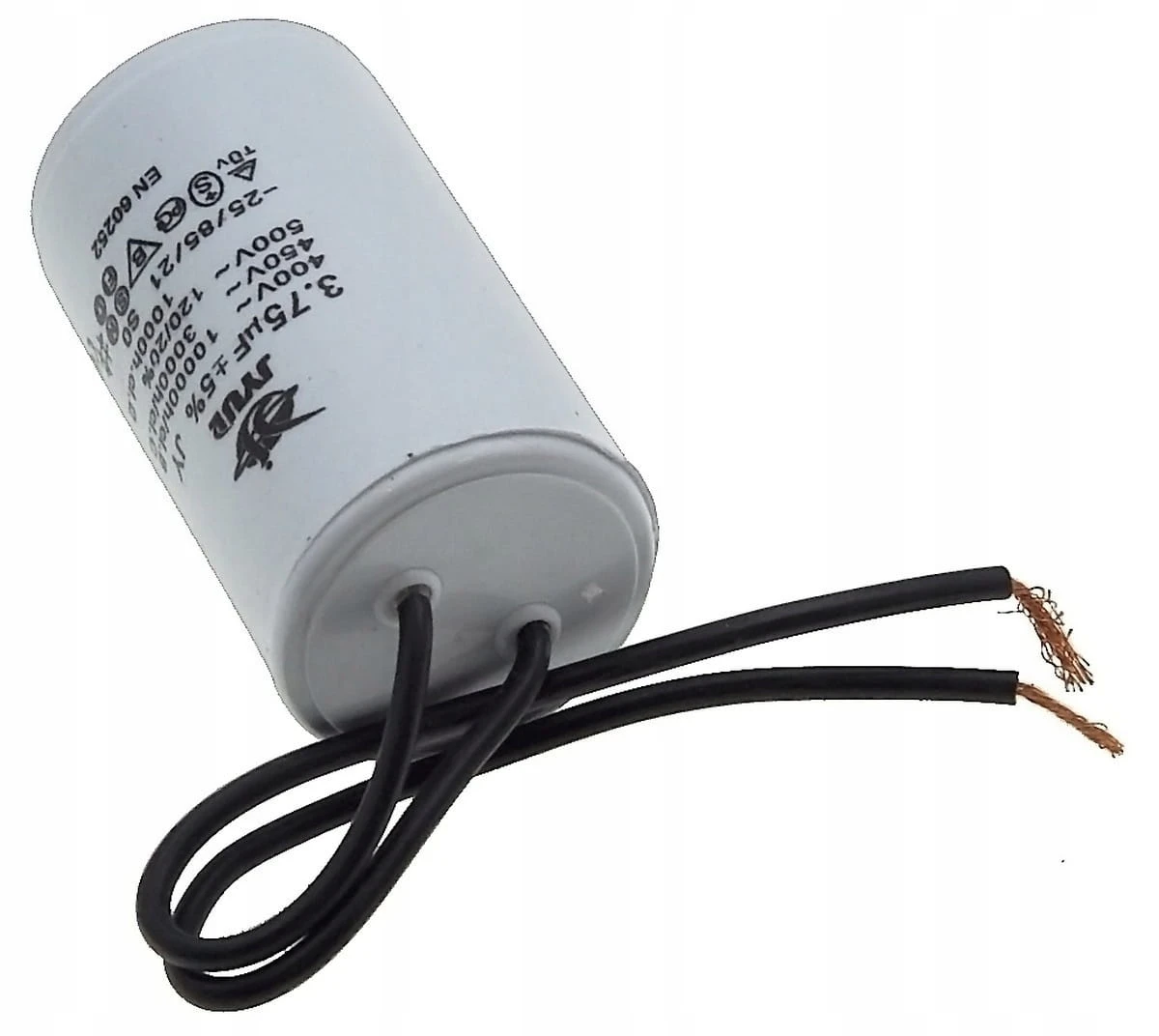 Kondensator rozruchowy JYUL o pojemności 3,75 µF i napięciu znamionowym 450 VAC. Wyposażony w przewody o długości 30-53 mm, co ułatwia instalację. Idealny do zastosowań w silnikach elektrycznych oraz innych urządzeniach wymagających wsparcia przy rozruchu.