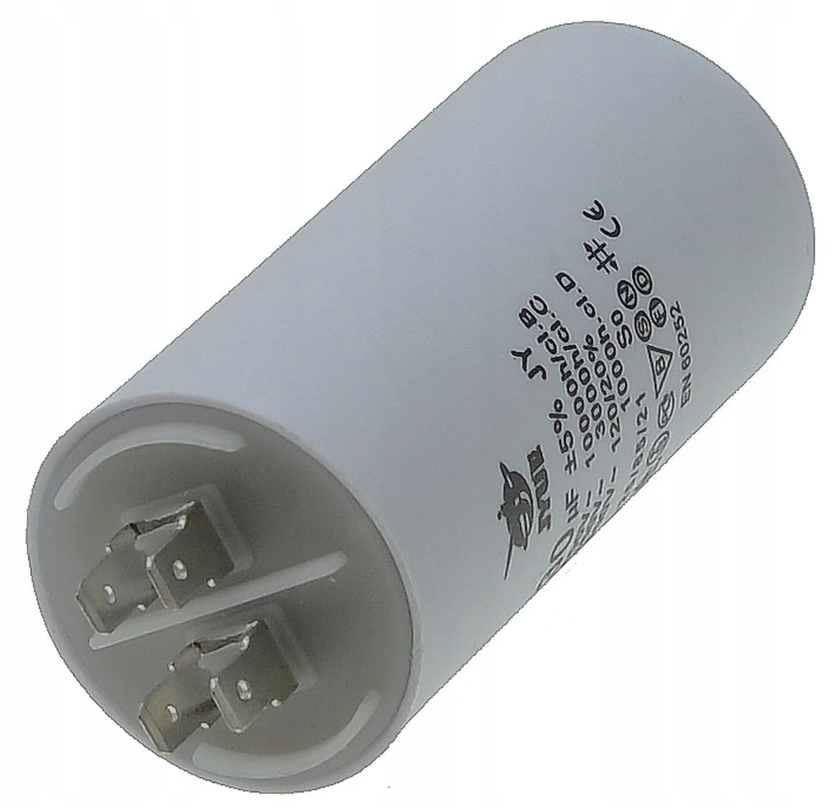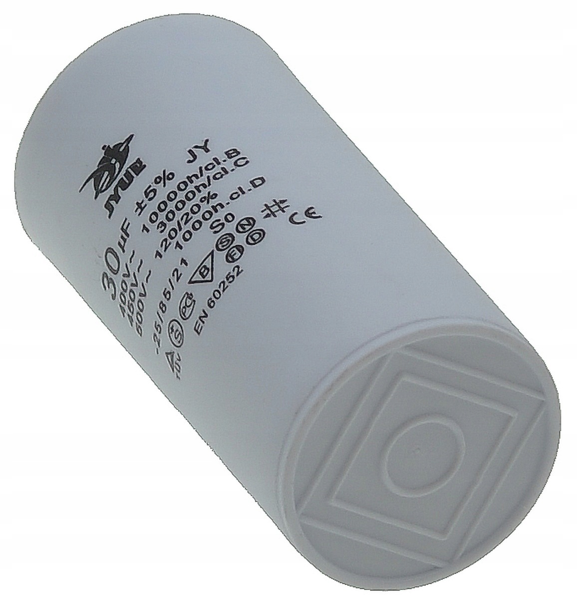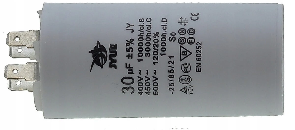 Kondensator JYUL o pojemności 30 µF i napięciu znamionowym 450 VAC. Wyposażony w zaciski, co ułatwia instalację. Idealny do zastosowań w różnych urządzeniach elektrycznych wymagających takiej pojemności.