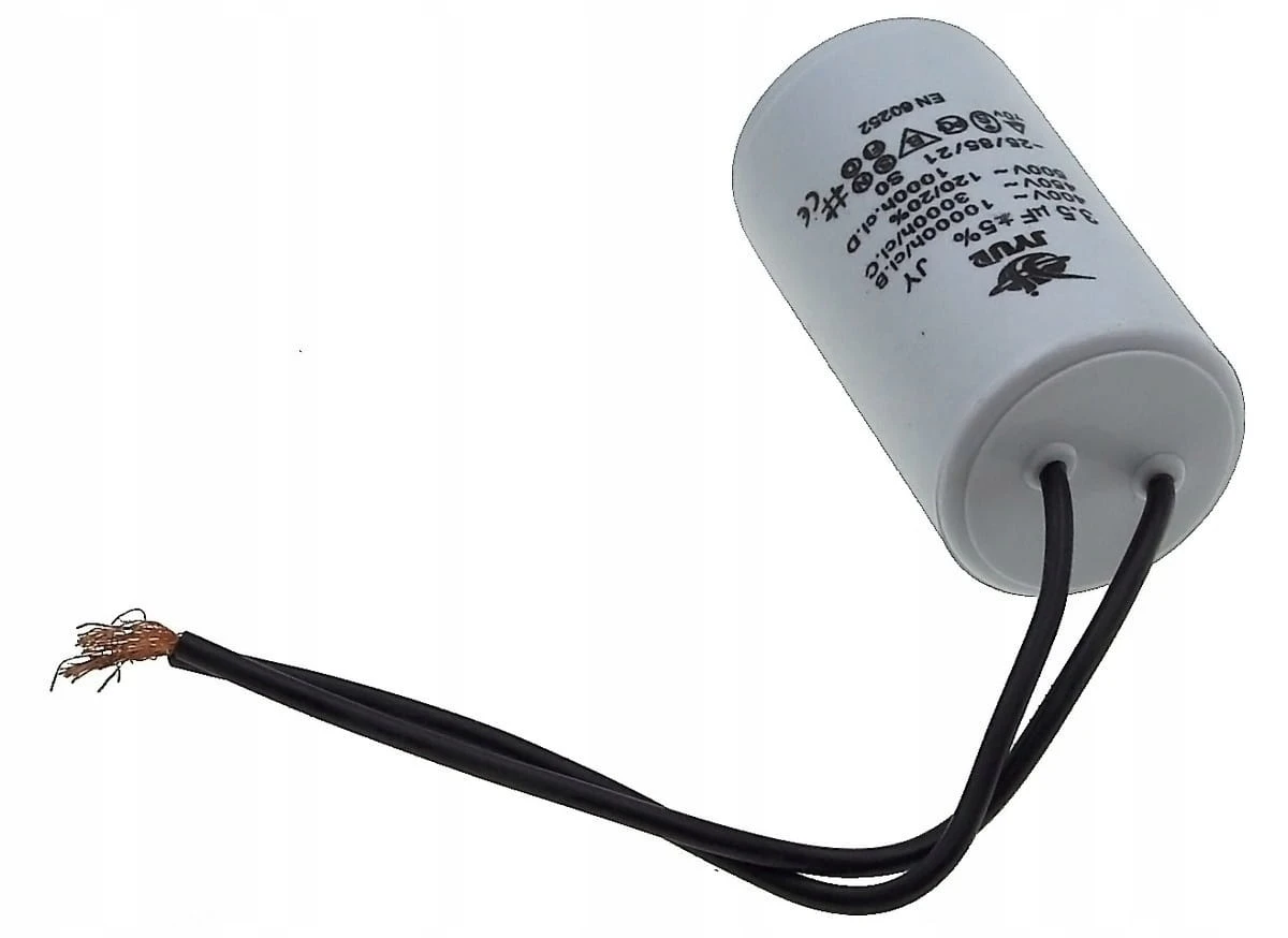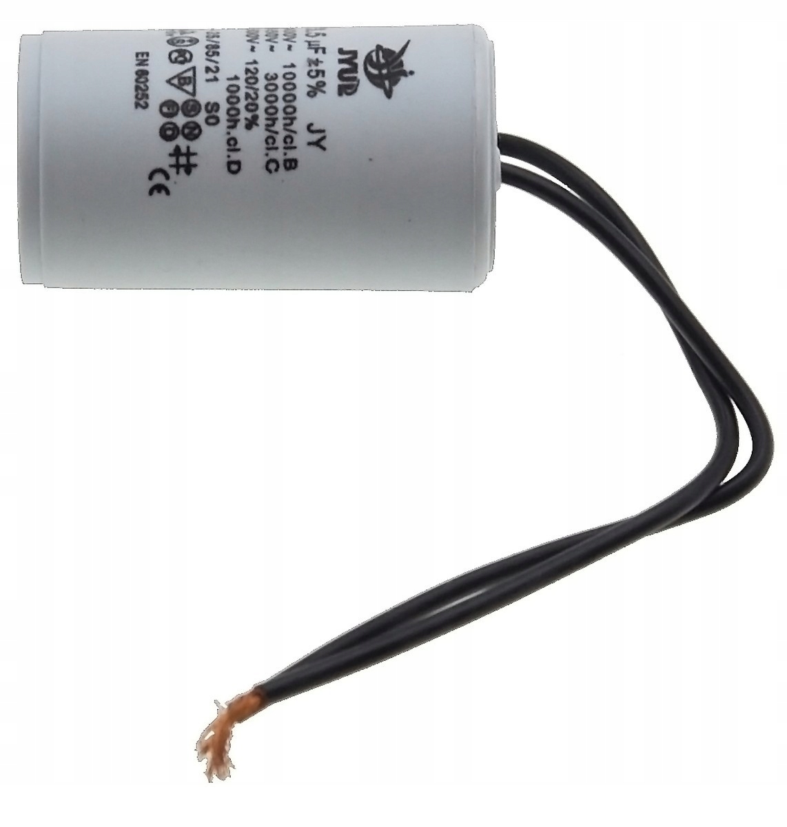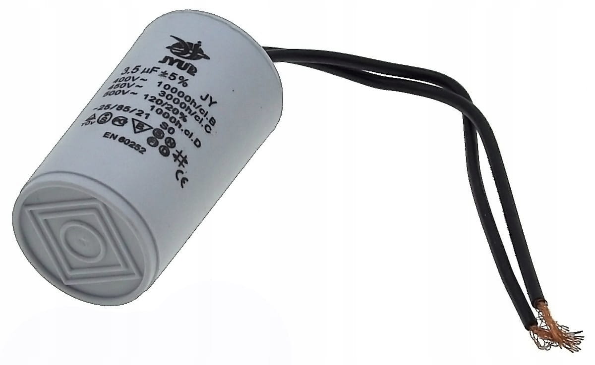 Kondensator rozruchowy JYUL o pojemności 35 µF i napięciu znamionowym 450 VAC. Wyposażony w przewody o długości 30-53 mm, co ułatwia instalację. Idealny do zastosowań w silnikach elektrycznych oraz innych urządzeniach wymagających wsparcia przy rozruchu.