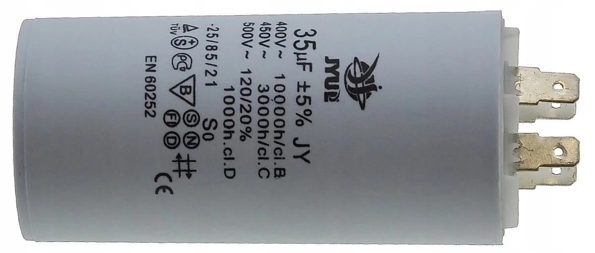 Kondensator JYUL o pojemności 35 µF i napięciu znamionowym 450 VAC. Wyposażony w zaciski, co ułatwia instalację. Idealny do zastosowań w różnych urządzeniach elektrycznych wymagających takiej pojemności.