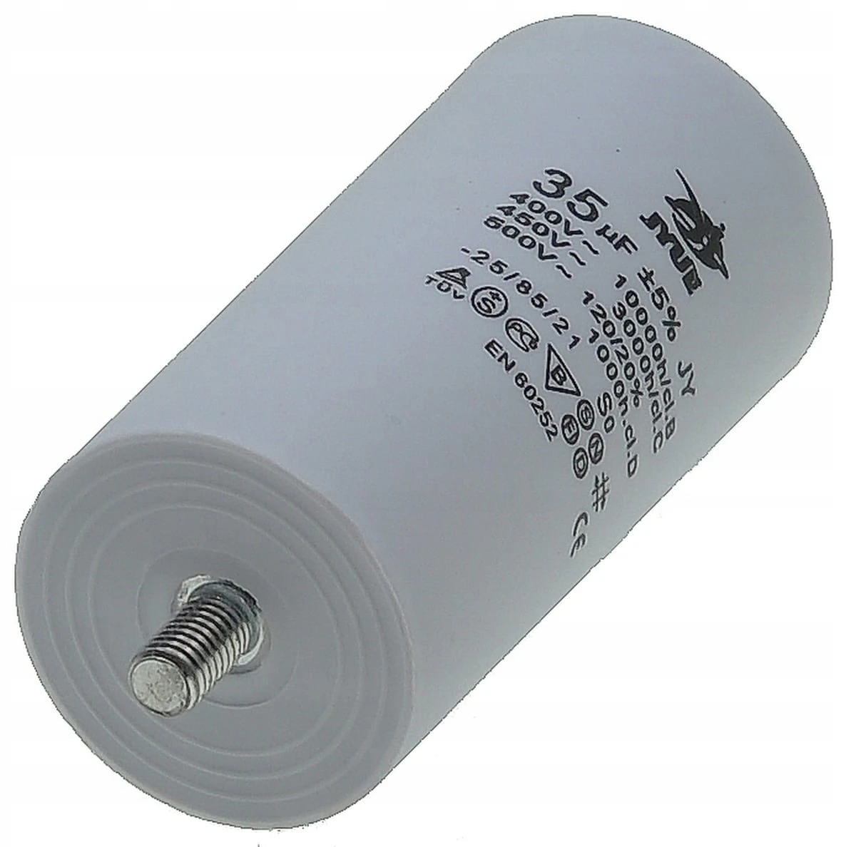 Kondensator rozruchowy JYUL o pojemności 35 µF i napięciu znamionowym 450 VAC. Wyposażony w mocowanie śrubowe oraz zaciski, co ułatwia instalację. Idealny do zastosowań w silnikach jednofazowych oraz innych urządzeniach wymagających wsparcia przy rozruchu.