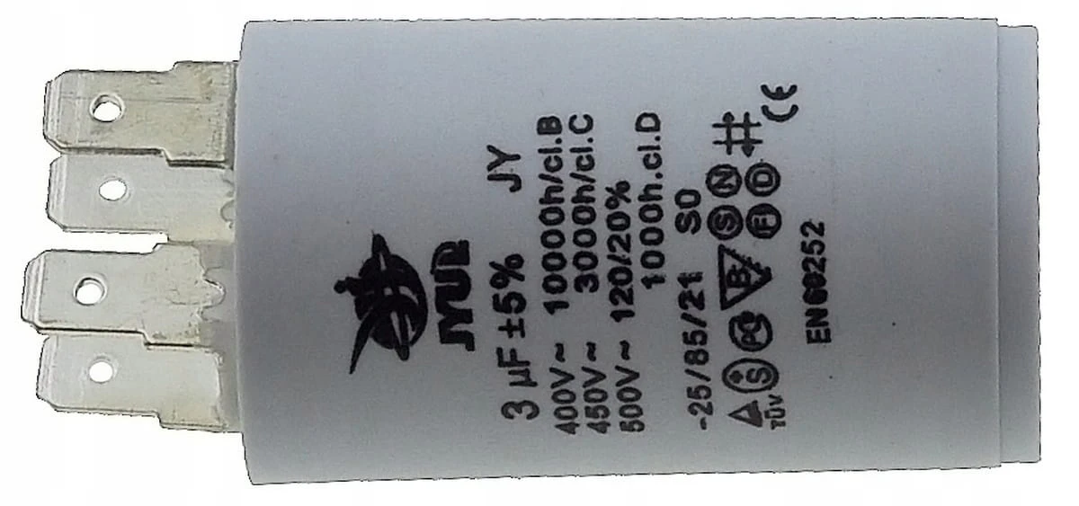 Kondensator JYUL o pojemności 3 µF i napięciu znamionowym 450 VAC. Wyposażony w zaciski, co ułatwia instalację. Idealny do zastosowań w różnych urządzeniach elektrycznych wymagających takiej pojemności.