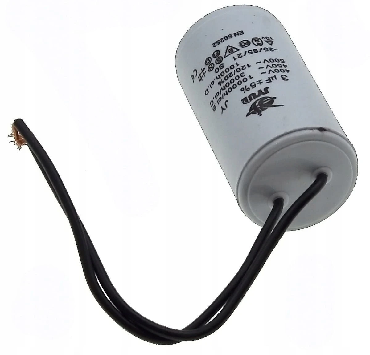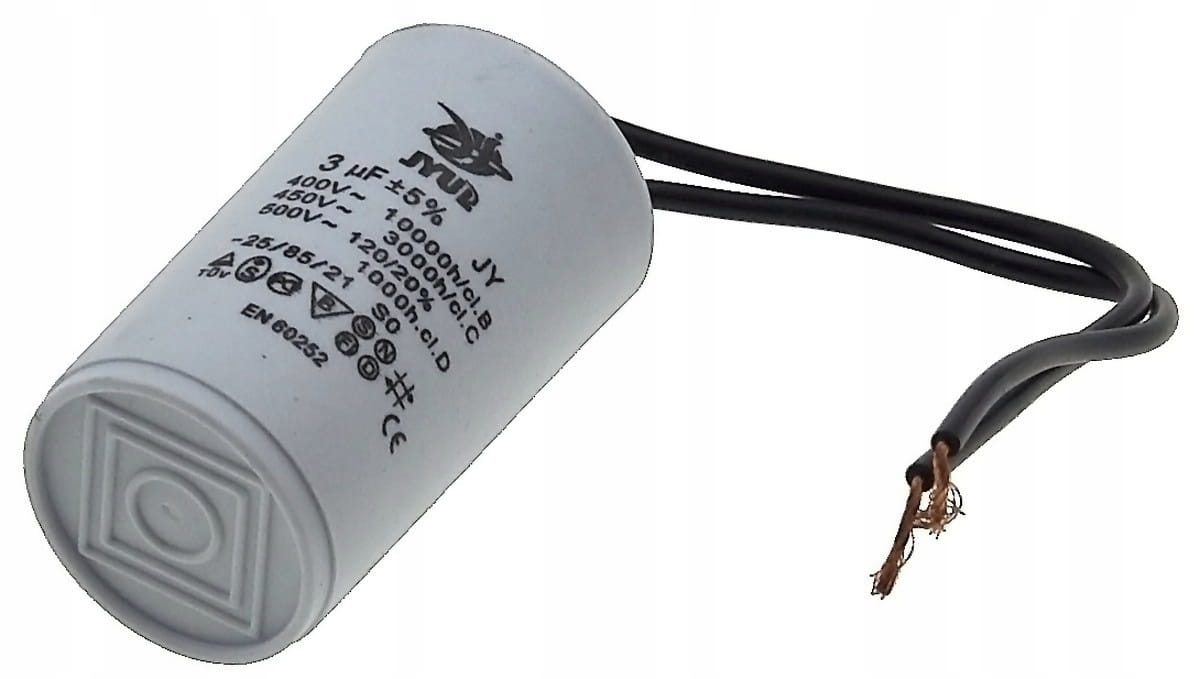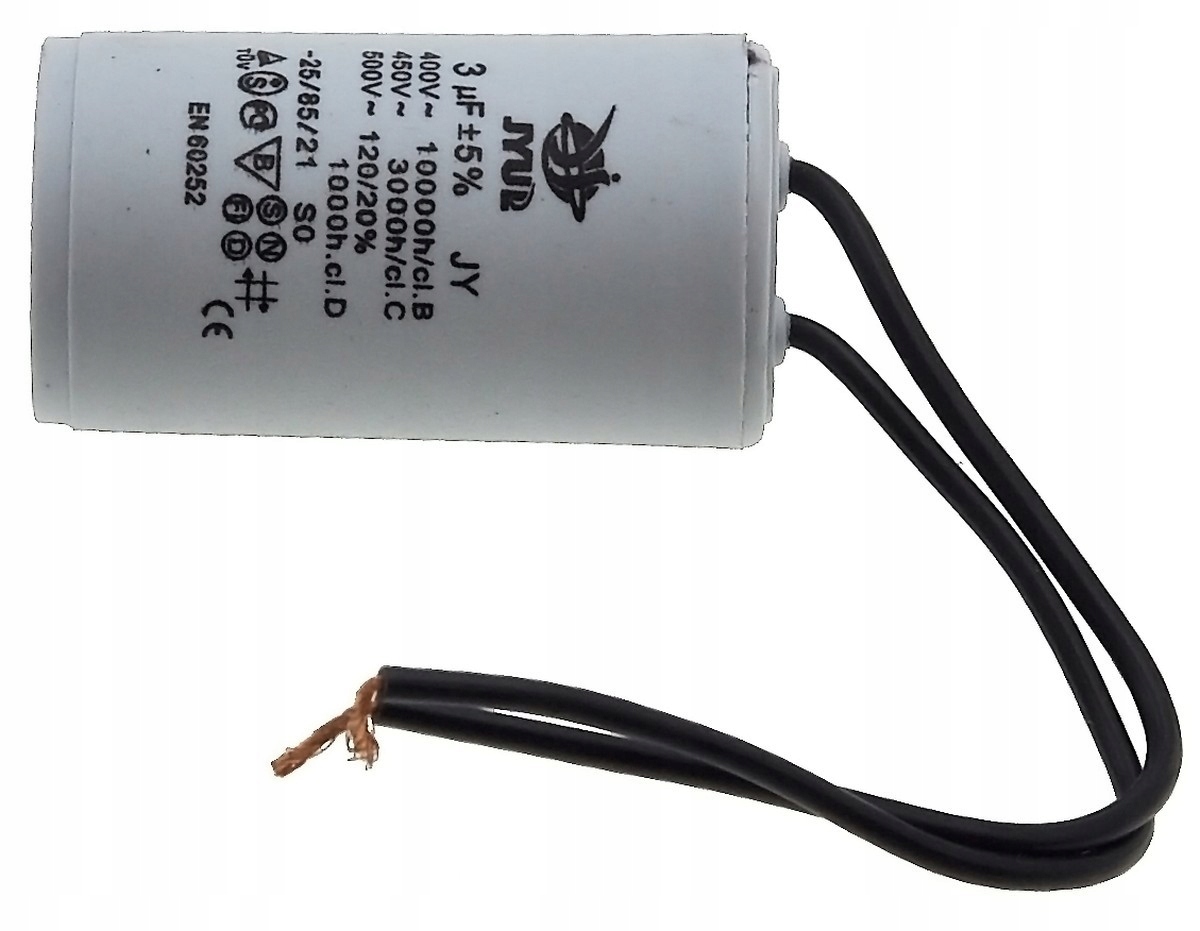 Kondensator rozruchowy JYUL o pojemności 3 µF i napięciu znamionowym 450 VAC. Wyposażony w przewody o długości 30-53 mm, co ułatwia instalację. Idealny do zastosowań w silnikach elektrycznych oraz innych urządzeniach wymagających wsparcia przy rozruchu.