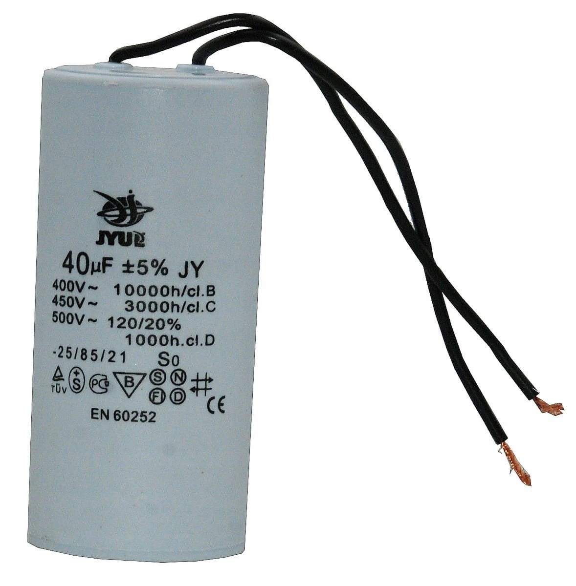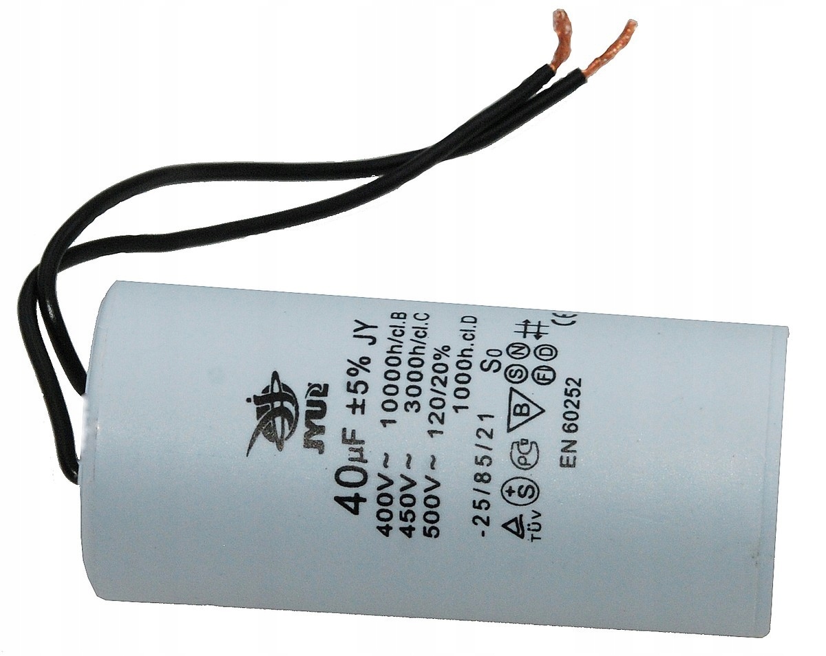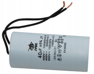 Kondensator rozruchowy JYUL o pojemności 40 µF i napięciu znamionowym 450 VAC. Wyposażony w przewody o długości 64/132 mm, co ułatwia instalację. Idealny do zastosowań w silnikach elektrycznych oraz innych urządzeniach wymagających wsparcia przy rozruchu.