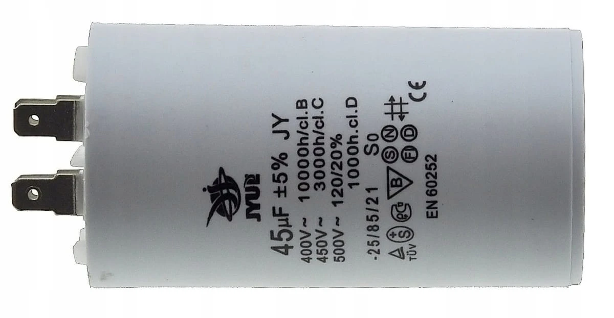 Kondensator JYUL o pojemności 45 µF i napięciu znamionowym 450 VAC. Wyposażony w zaciski, co ułatwia instalację. Idealny do zastosowań w różnych urządzeniach elektrycznych wymagających takiej pojemności.