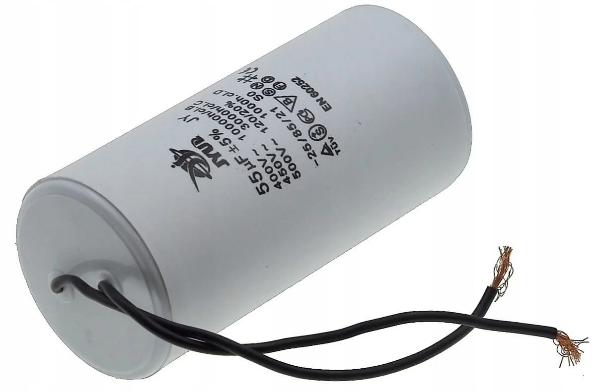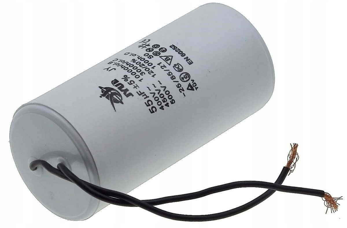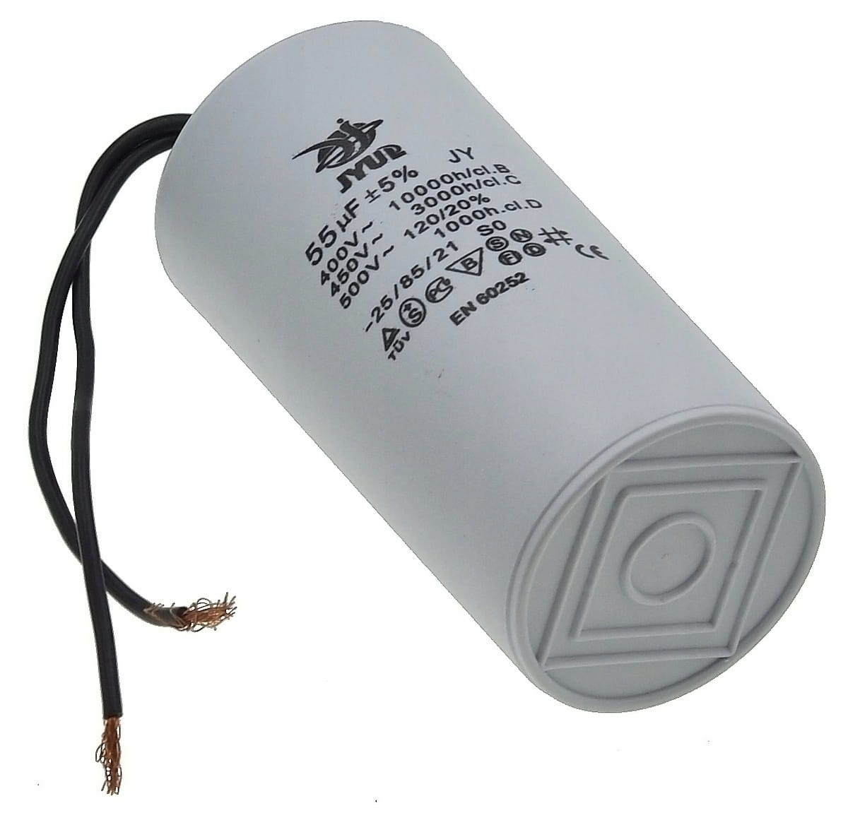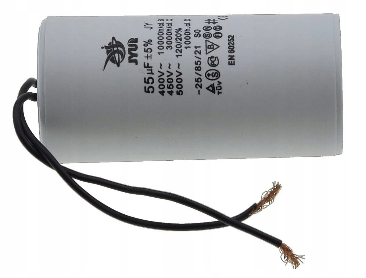 Kondensator rozruchowy JYUL o pojemności 55 µF i napięciu znamionowym 450 VAC. Wyposażony w przewody o długości 50/103 mm, co ułatwia instalację. Idealny do zastosowań w silnikach elektrycznych oraz innych urządzeniach wymagających wsparcia przy rozruchu.