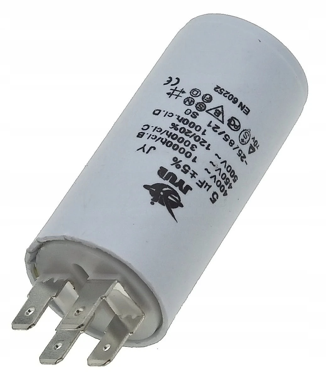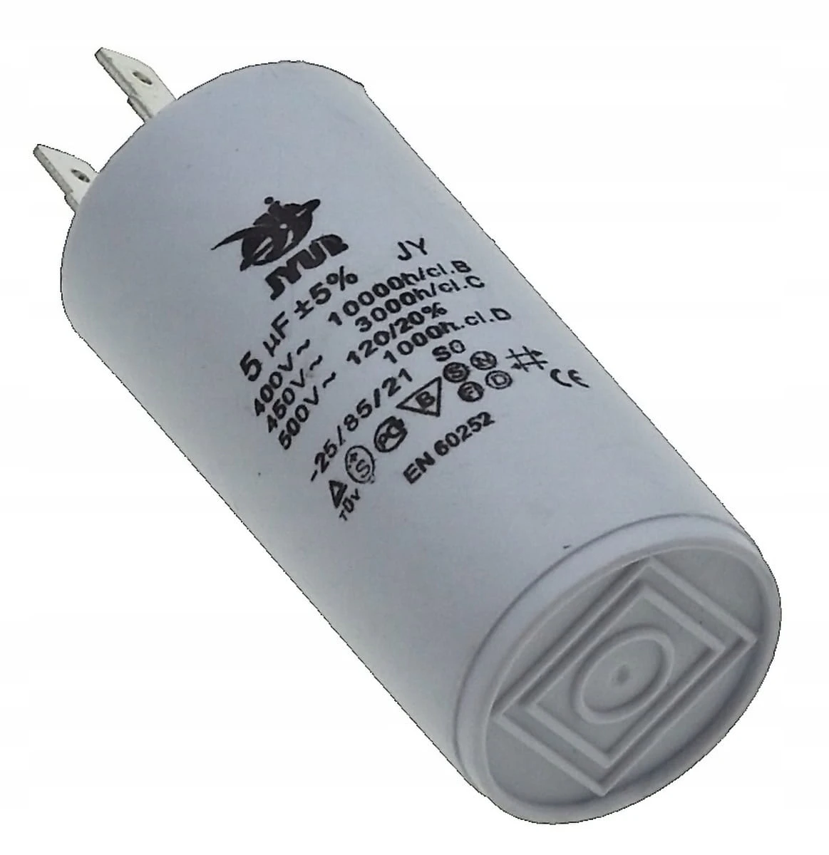Kondensator JYUL o pojemności 5 µF i napięciu znamionowym 450 VAC. Wyposażony w zaciski, co ułatwia instalację. Idealny do zastosowań w różnych urządzeniach elektrycznych wymagających takiej pojemności.