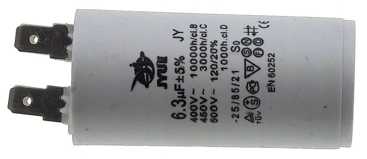Kondensator JYUL o pojemności 6,3 µF i napięciu znamionowym 450 VAC. Wyposażony w zaciski, co ułatwia instalację. Idealny do zastosowań w różnych urządzeniach elektrycznych wymagających takiej pojemności.