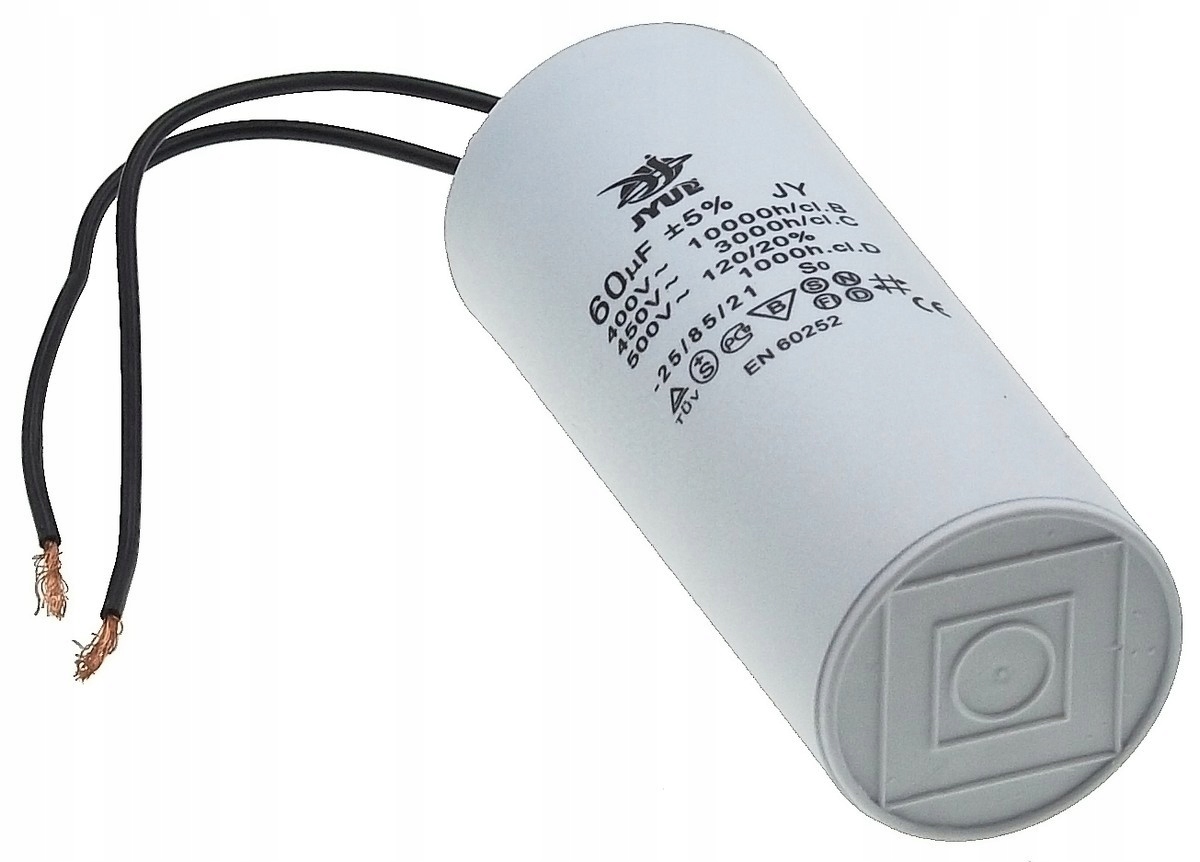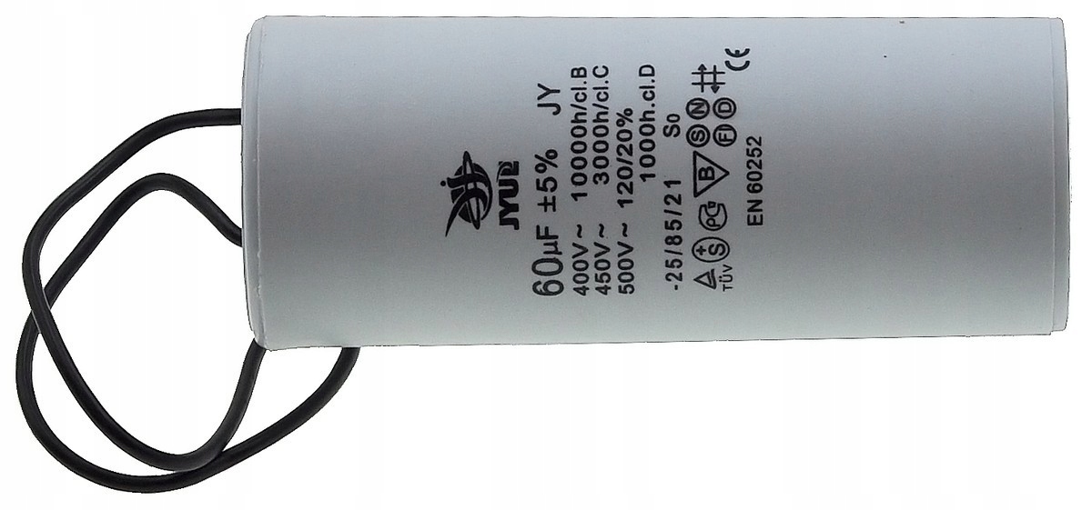 Kondensator rozruchowy JYUL o pojemności 60 µF i napięciu znamionowym 400 VAC. Wyposażony w przewody o długości 50/123 mm, co ułatwia instalację. Idealny do zastosowań w silnikach elektrycznych oraz innych urządzeniach wymagających wsparcia przy rozruchu.