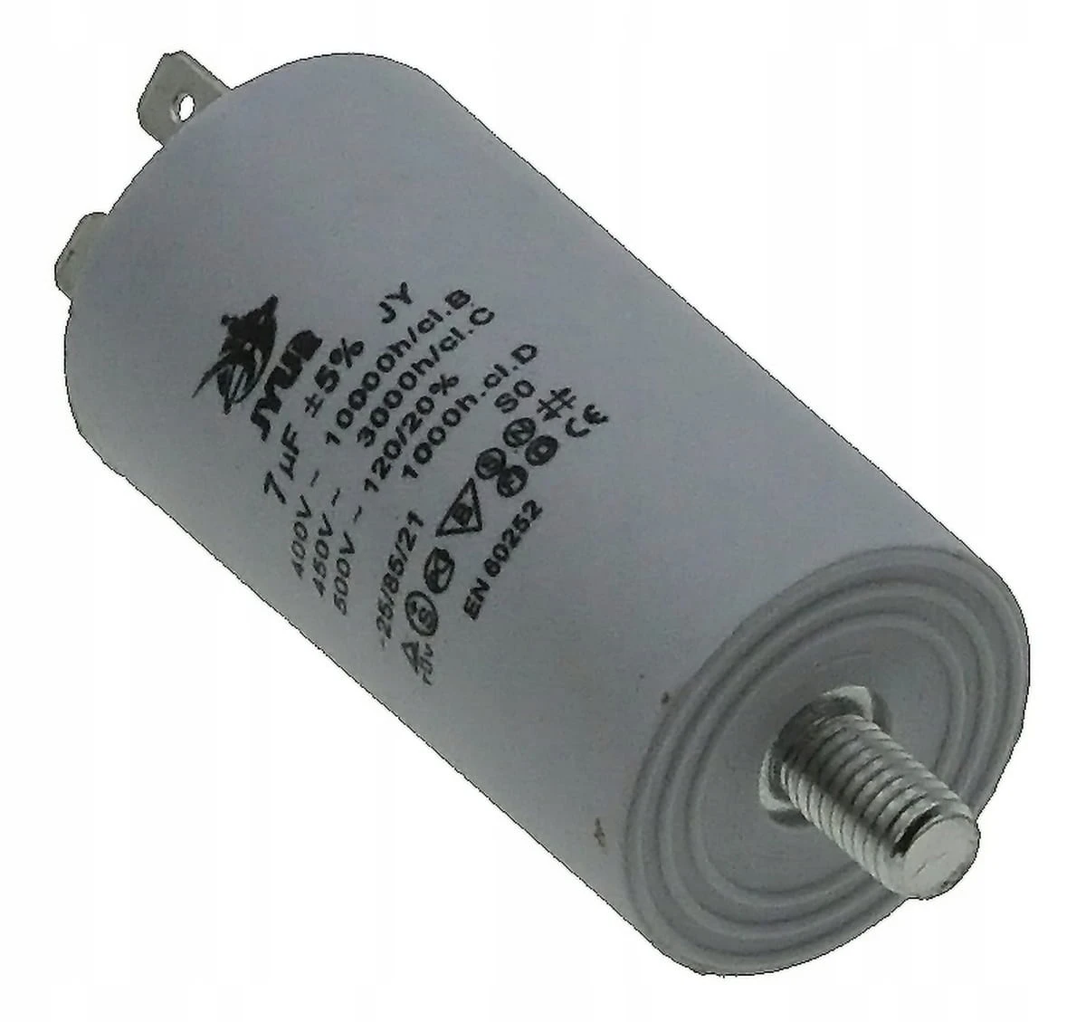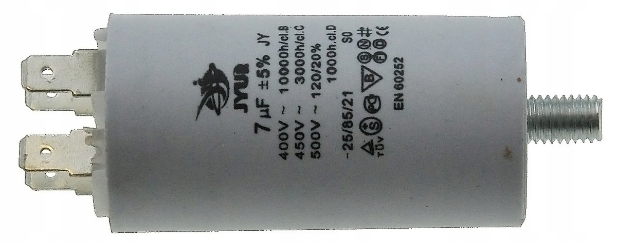 Kondensator rozruchowy JYUL o pojemności 7 µF i napięciu znamionowym 450 VAC. Wyposażony w mocowanie śrubowe oraz zaciski, co ułatwia instalację. Idealny do zastosowań w silnikach jednofazowych oraz innych urządzeniach wymagających wsparcia przy rozruchu.