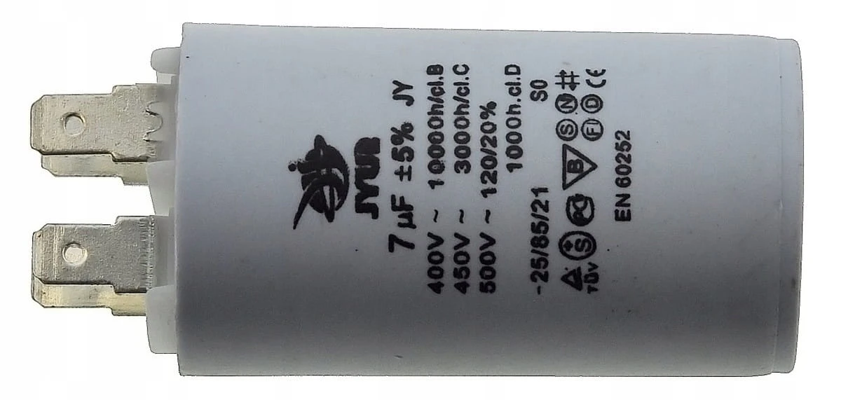Kondensator JYUL o pojemności 7 µF i napięciu znamionowym 450 VAC. Wyposażony w zaciski, co ułatwia instalację. Idealny do zastosowań w różnych urządzeniach elektrycznych wymagających takiej pojemności.