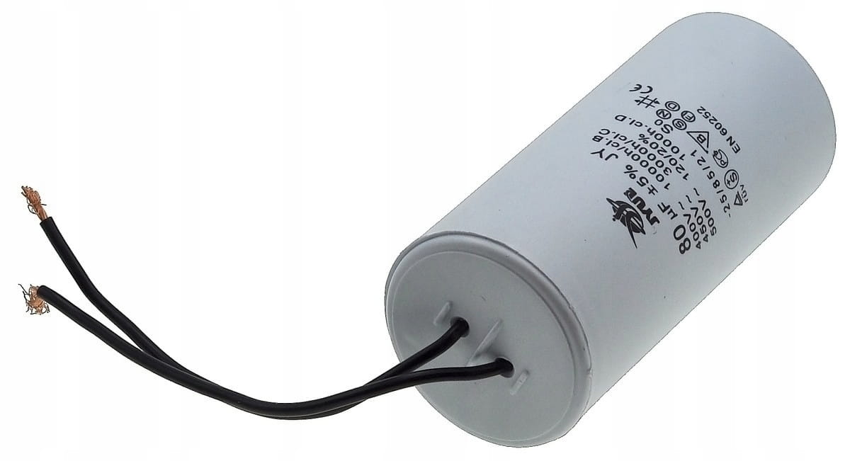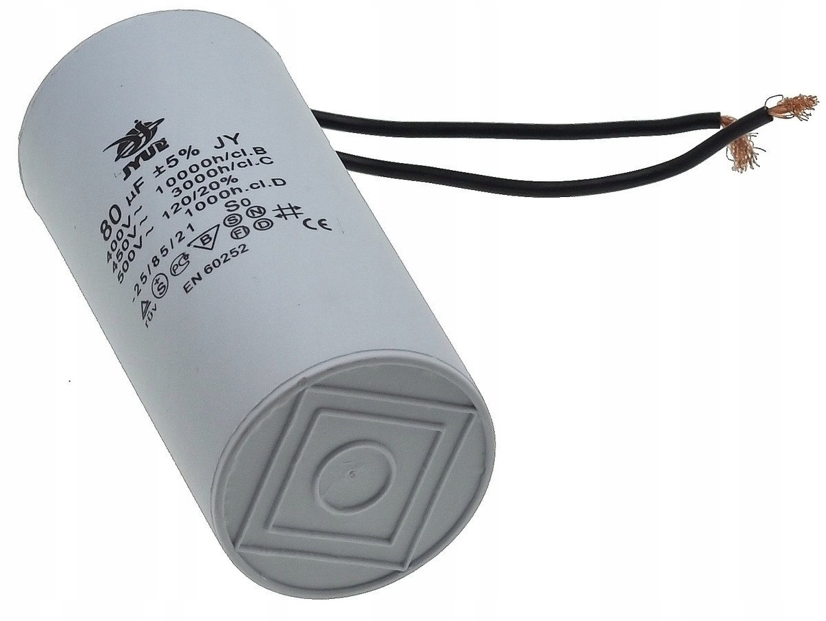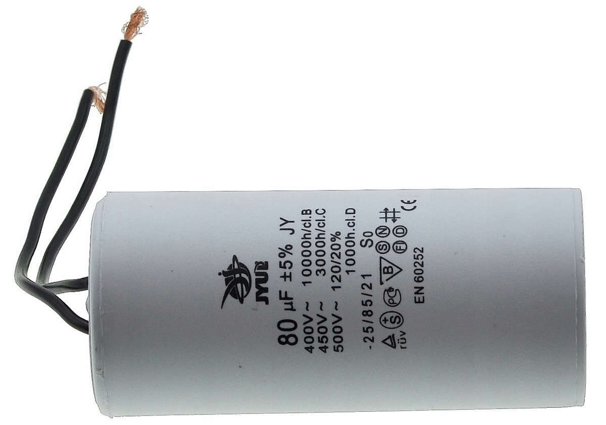 Kondensator rozruchowy JYUL o pojemności 80 µF i napięciu znamionowym 450 VAC. Wyposażony w przewody o długości 55/120 mm, co ułatwia instalację. Idealny do zastosowań w silnikach elektrycznych oraz innych urządzeniach wymagających wsparcia przy rozruchu.