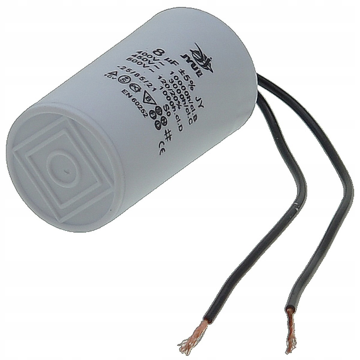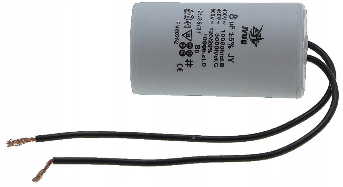 Kondensator rozruchowy JYUL o pojemności 8 µF i napięciu znamionowym 450 VAC. Wyposażony w przewody o długości 35-63 mm, co ułatwia instalację. Idealny do zastosowań w silnikach elektrycznych oraz innych urządzeniach wymagających wsparcia przy rozruchu.