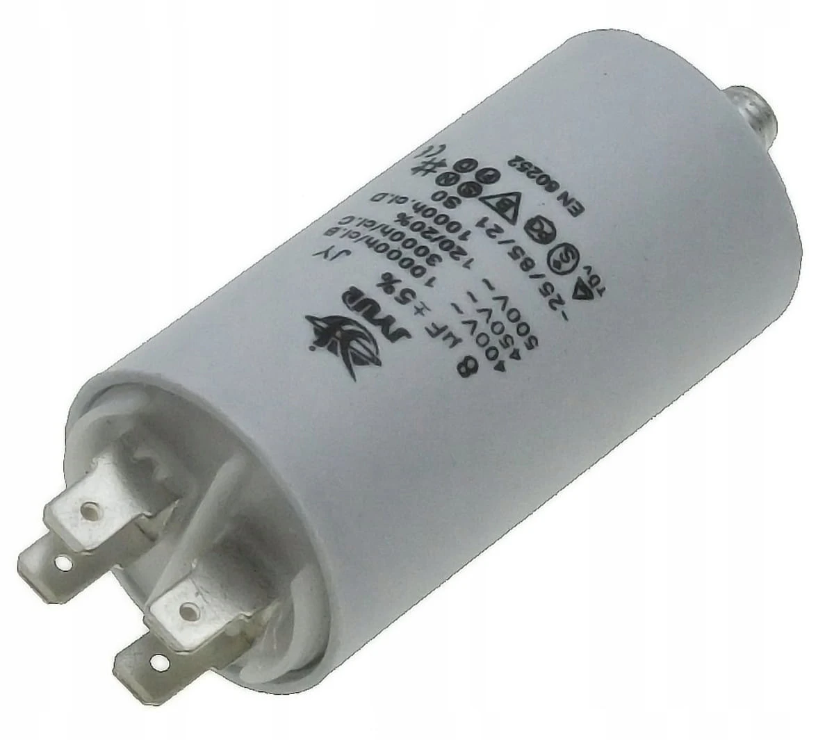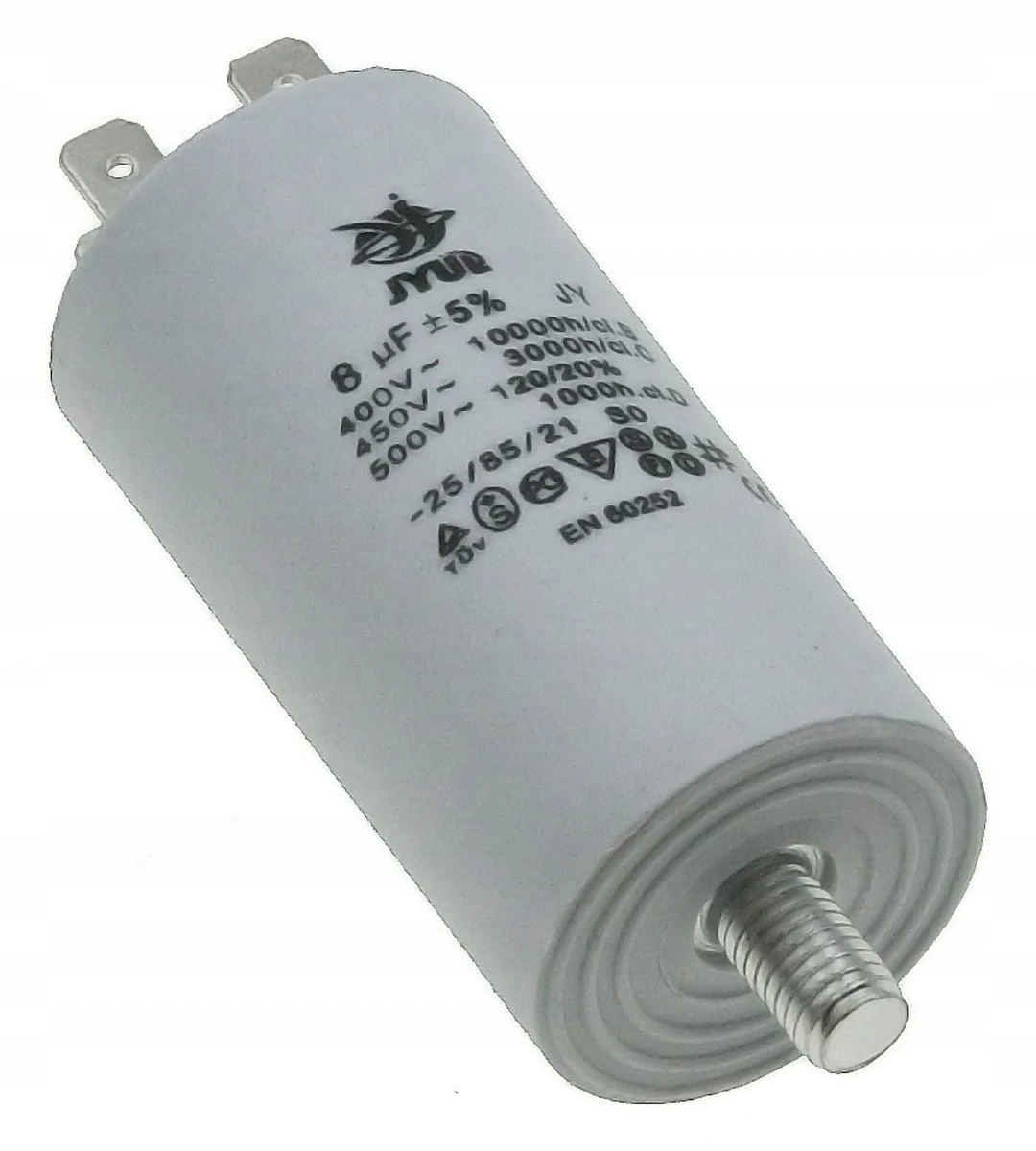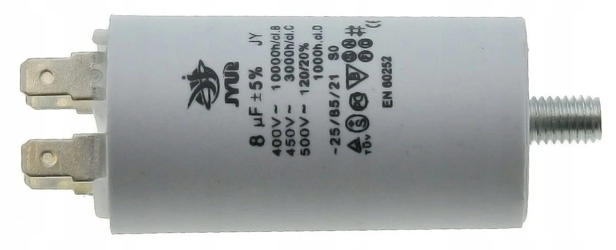 Kondensator rozruchowy JYUL o pojemności 8 µF i napięciu znamionowym 450 VAC. Wyposażony w mocowanie śrubowe oraz zaciski, co ułatwia instalację. Idealny do zastosowań w silnikach jednofazowych oraz innych urządzeniach wymagających wsparcia przy rozruchu.