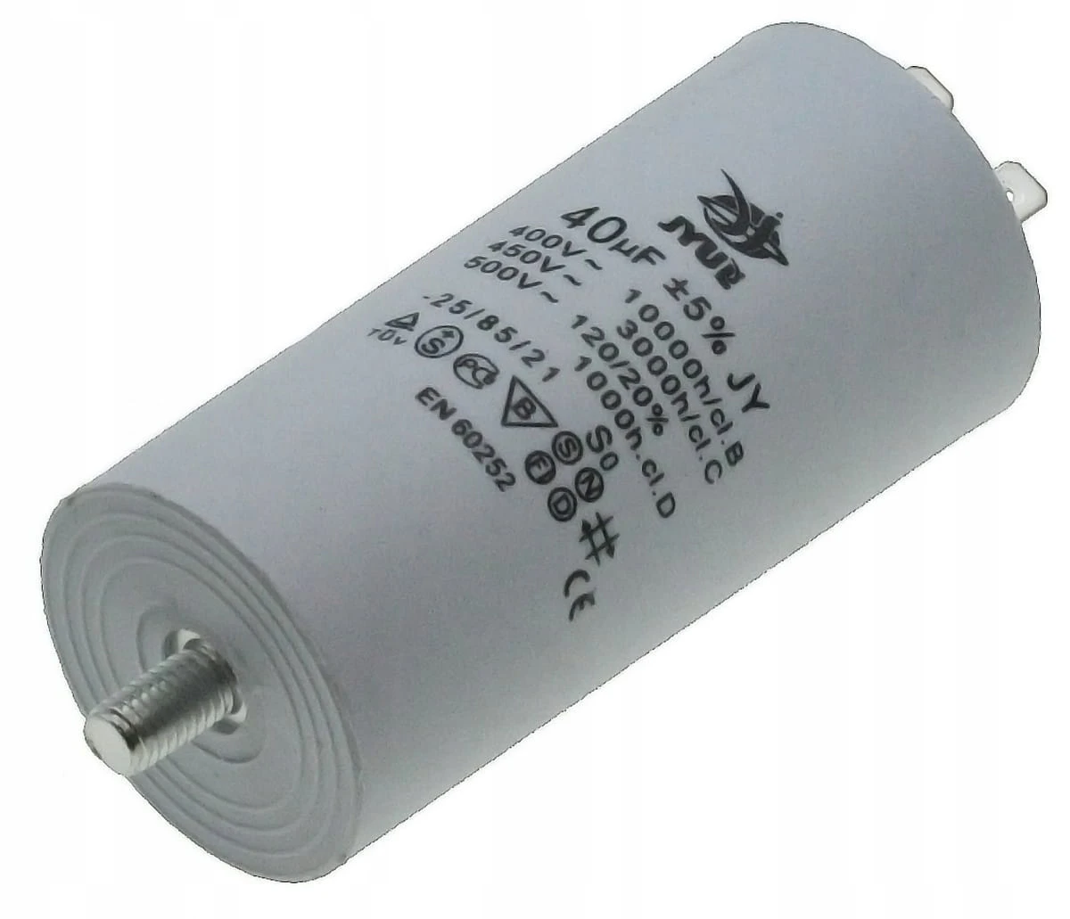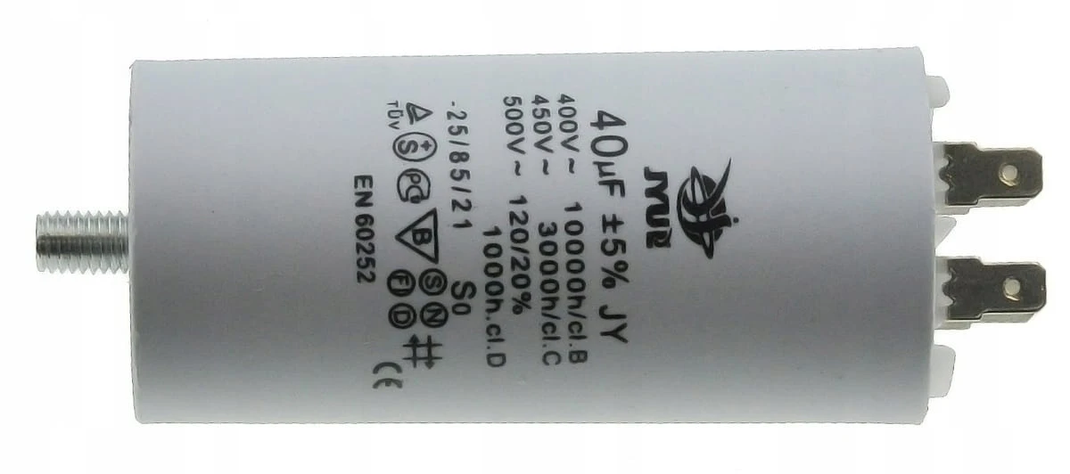 Kondensator rozruchowy JYUL o pojemności 40 µF i napięciu znamionowym 450 VAC. Wyposażony w mocowanie śrubowe oraz zaciski, co ułatwia instalację. Idealny do zastosowań w silnikach jednofazowych oraz innych urządzeniach wymagających wsparcia przy rozruchu.