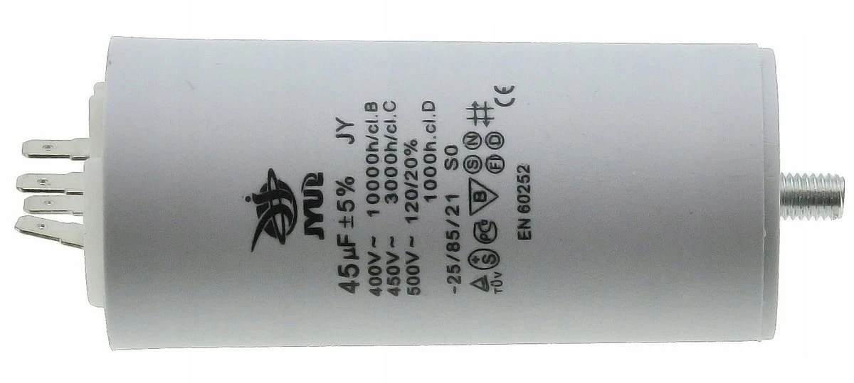 Kondensator rozruchowy JYUL o pojemności 45 µF i napięciu znamionowym 450 VAC. Wyposażony w mocowanie śrubowe oraz zaciski, co ułatwia instalację. Idealny do zastosowań w silnikach jednofazowych oraz innych urządzeniach wymagających wsparcia przy rozruchu.