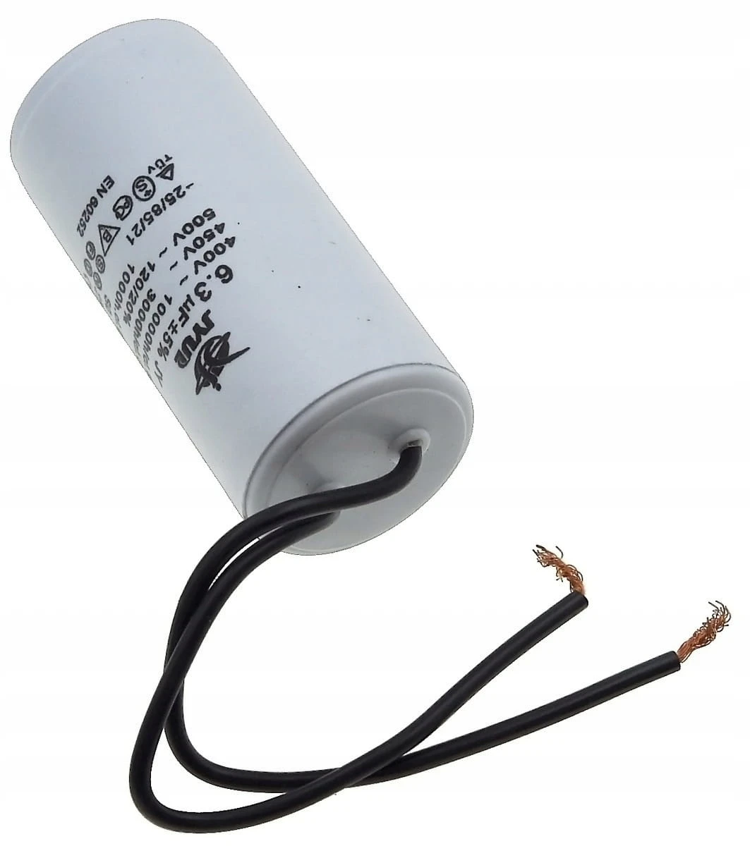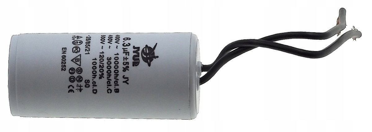 Kondensator rozruchowy JYUL o pojemności 6,3 µF i napięciu znamionowym 450 VAC. Wyposażony w przewody o długości 30-65 mm, co ułatwia instalację. Idealny do zastosowań w silnikach elektrycznych oraz innych urządzeniach wymagających wsparcia przy rozruchu.