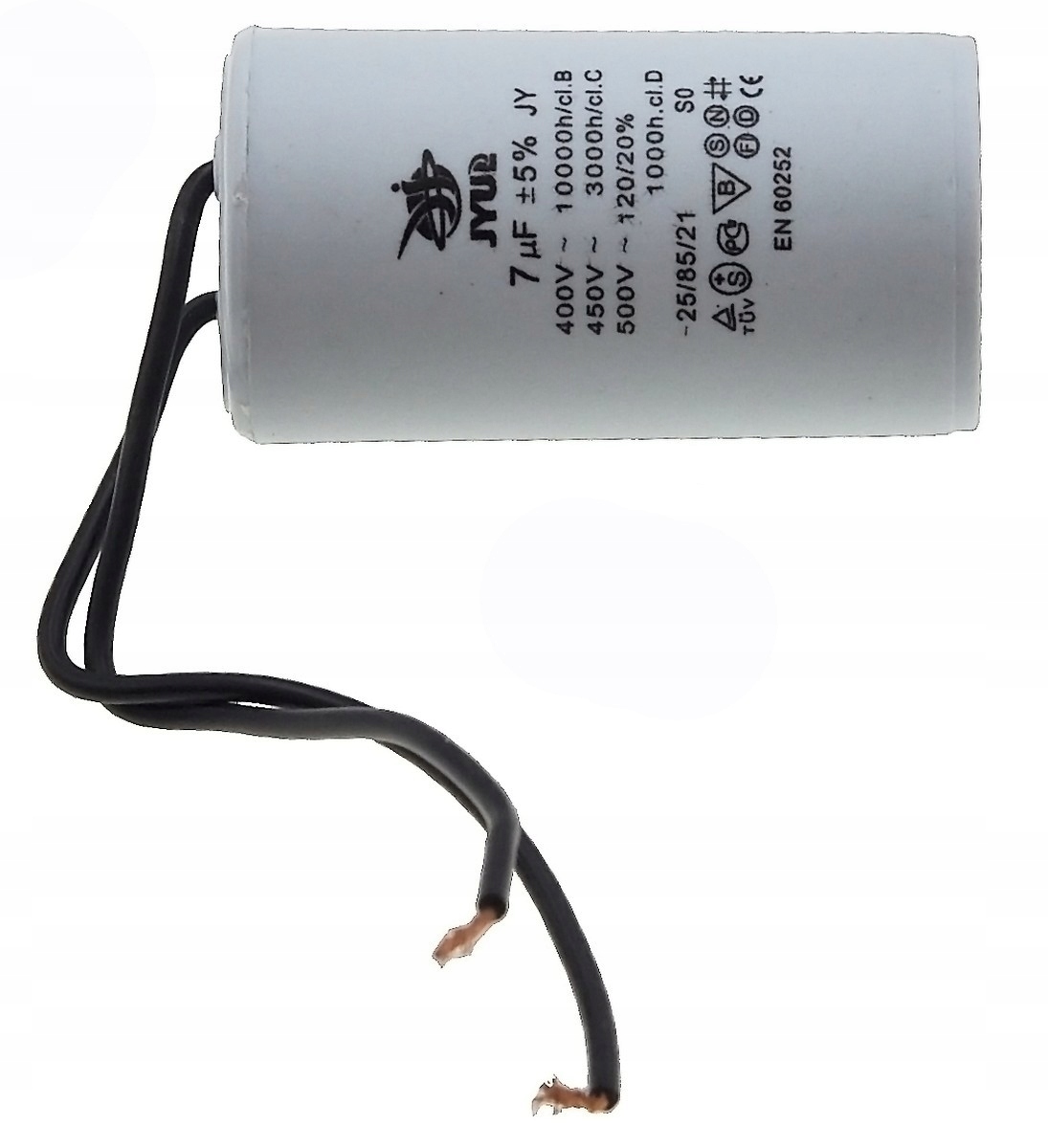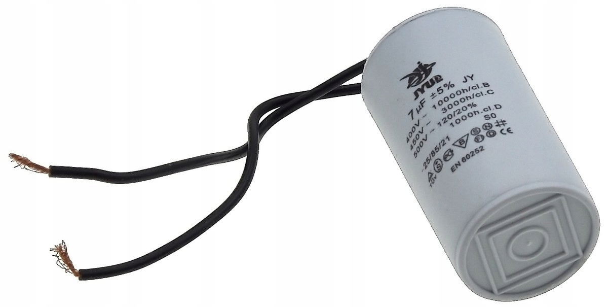 Kondensator rozruchowy JYUL o pojemności 7 µF i napięciu znamionowym 450 VAC. Wyposażony w przewody o długości 35-63 mm, co ułatwia instalację. Idealny do zastosowań w silnikach elektrycznych oraz innych urządzeniach wymagających wsparcia przy rozruchu.