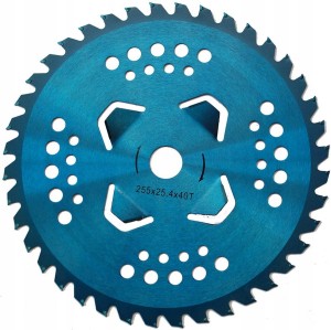 Nóż tnący o średnicy 255 mm z 40 zębami wykonanymi z węglików spiekanych to niezawodne narzędzie przeznaczone do podkaszarek i kos spalinowych. Jego wklęsła konstrukcja oraz precyzyjnie rozmieszczone zęby zapewniają efektywne i płynne cięcie różnorodnej roślinności, od trawy po gęste krzewy. Niebieskie wykończenie nadaje estetyczny wygląd, a solidne materiały gwarantują długą żywotność produktu.