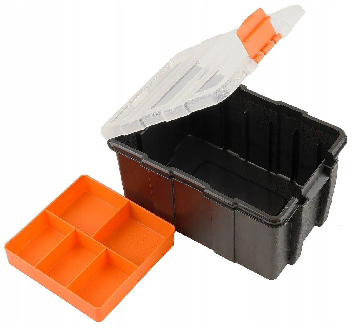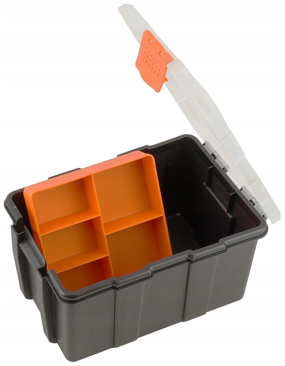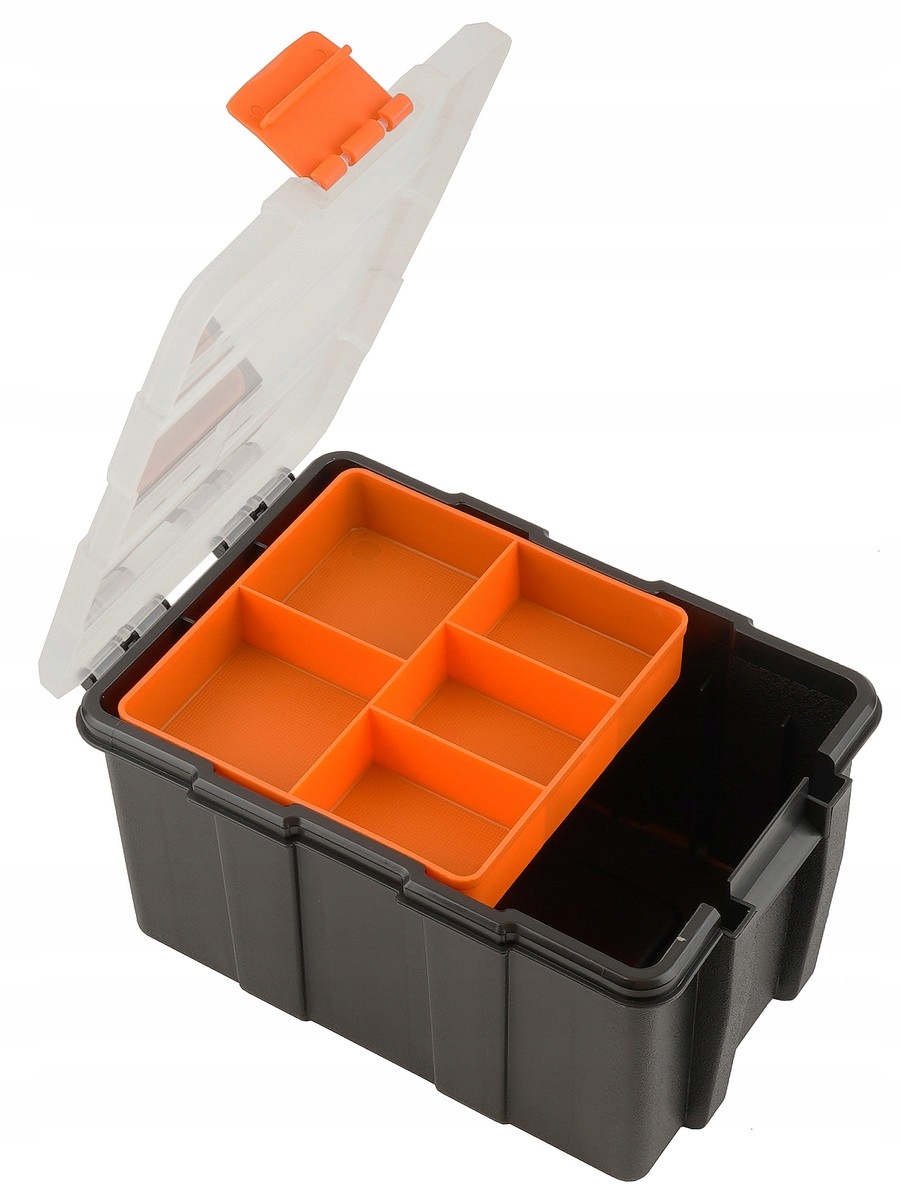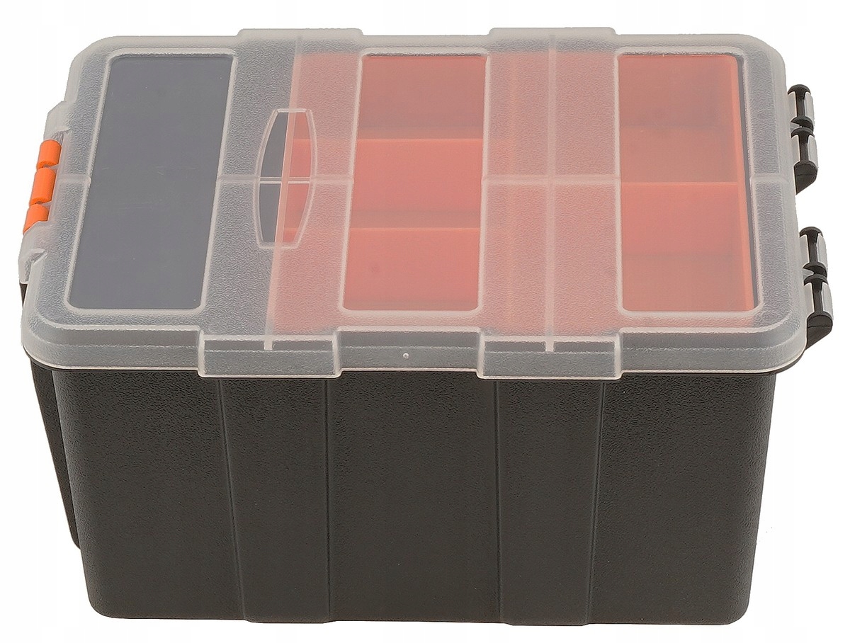 - Sześć przegródek — idealny do segregacji drobnych przedmiotów, biurowych akcesoriów lub części warsztatowych.