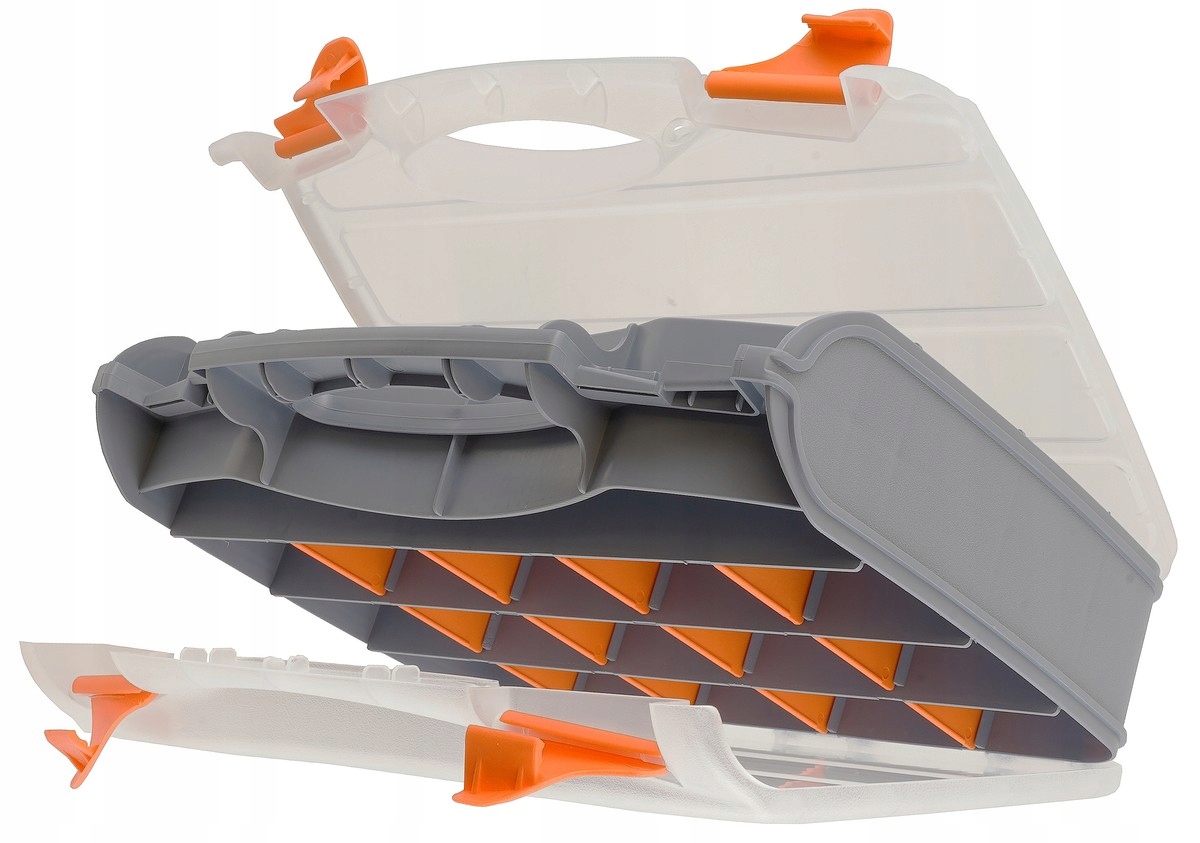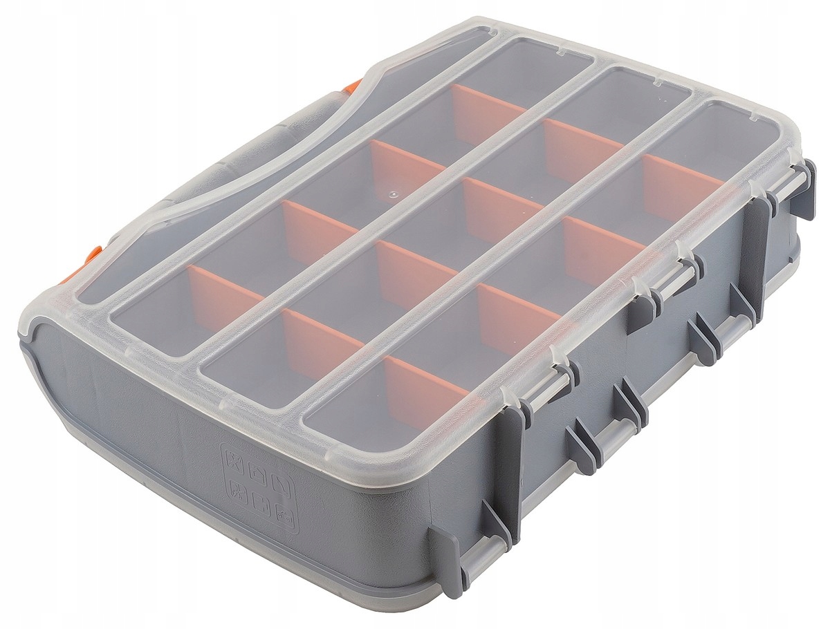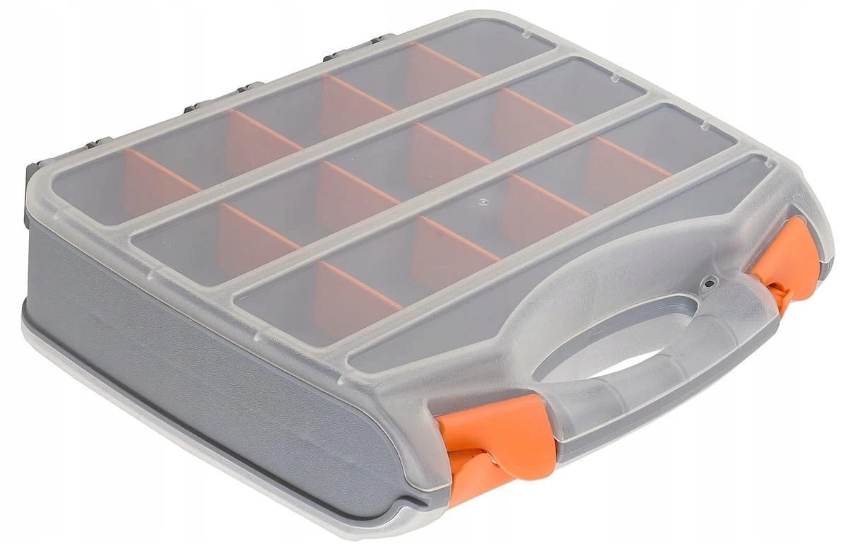 Organizer typu „kuferek” dwustronny, wyposażony w 30 sekcji (po 15 na każdej stronie) z wyjmowanymi przegródkami. Wymiary zewnętrzne 320×260×75 mm. Zaprojektowany do przechowywania i transportu drobnych przedmiotów: elementów złącznych, okuć, części zamiennych, akcesoriów wędkarskich czy niewielkich narzędzi. Przezroczyste pokrywy ułatwiają kontrolę zawartości i są odporne na pęknięcia. Organizer posiada mocną rączkę i zamki–zatrzaski, co zapewnia trwałość oraz komfort użytkowania.