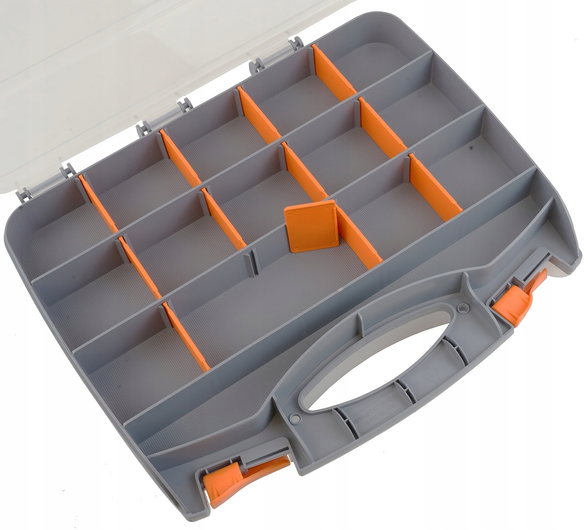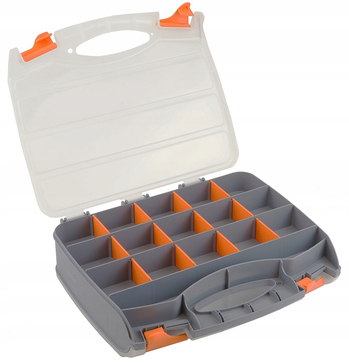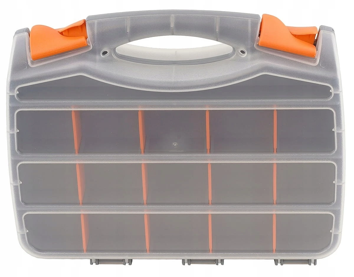 Organizer typu „kuferek” dwustronny, wyposażony w 30 sekcji (po 15 na każdej stronie) z wyjmowanymi przegródkami. Wymiary zewnętrzne 320×260×75 mm. Zaprojektowany do przechowywania i transportu drobnych przedmiotów: elementów złącznych, okuć, części zamiennych, akcesoriów wędkarskich czy niewielkich narzędzi. Przezroczyste pokrywy ułatwiają kontrolę zawartości i są odporne na pęknięcia. Organizer posiada mocną rączkę i zamki–zatrzaski, co zapewnia trwałość oraz komfort użytkowania.