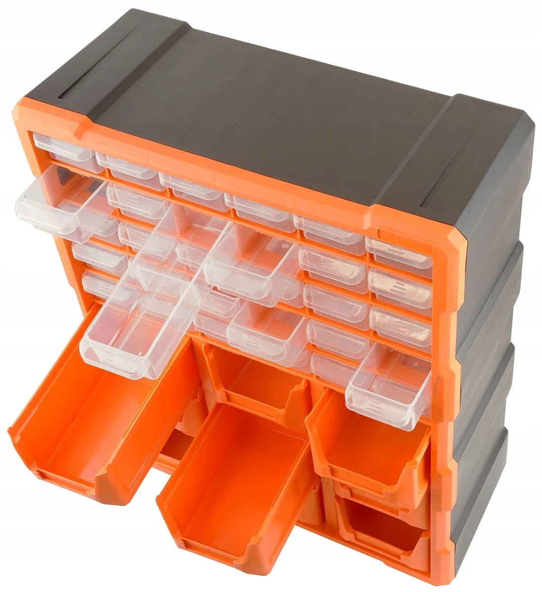 - Średnia pojemność – 30 małych szufladek oraz 9 dużych kontenerów zapewnia wygodną organizację wielu drobnych elementów.