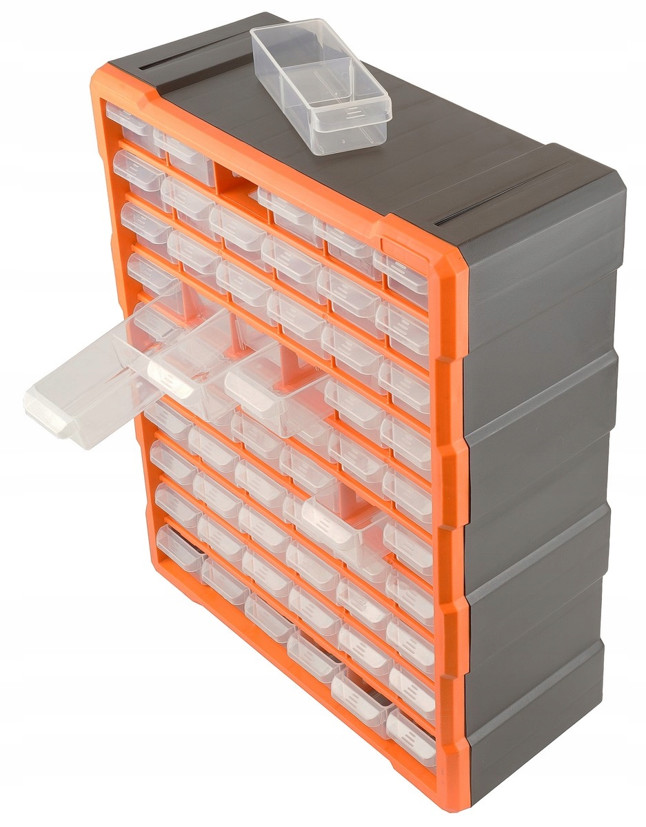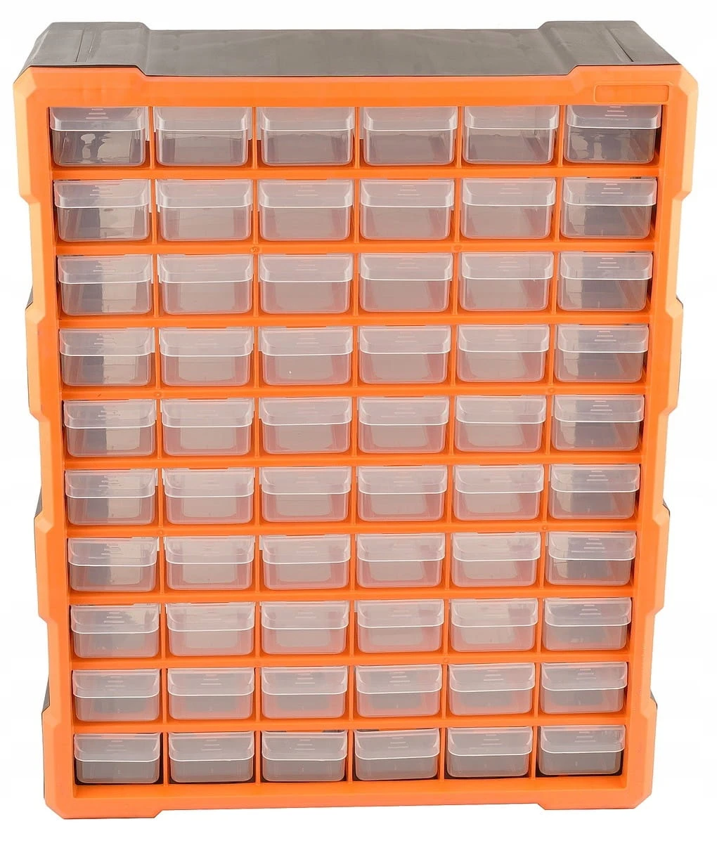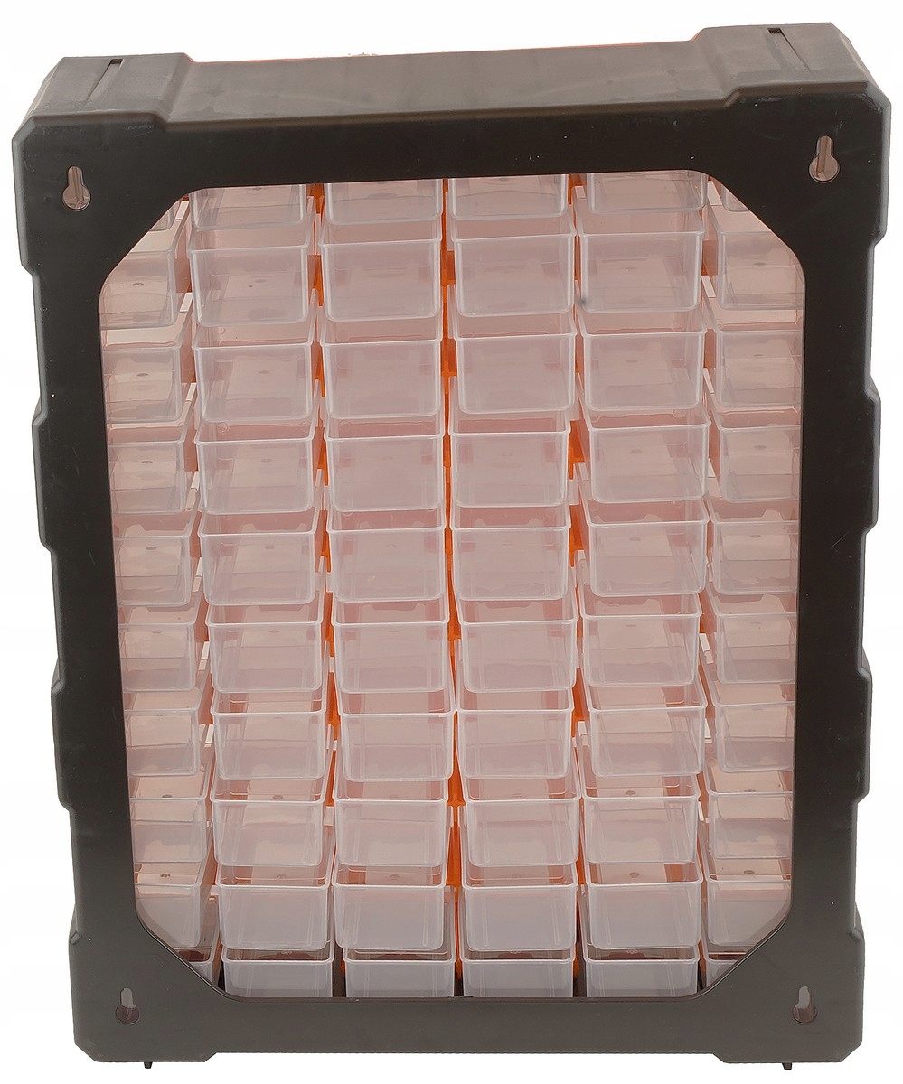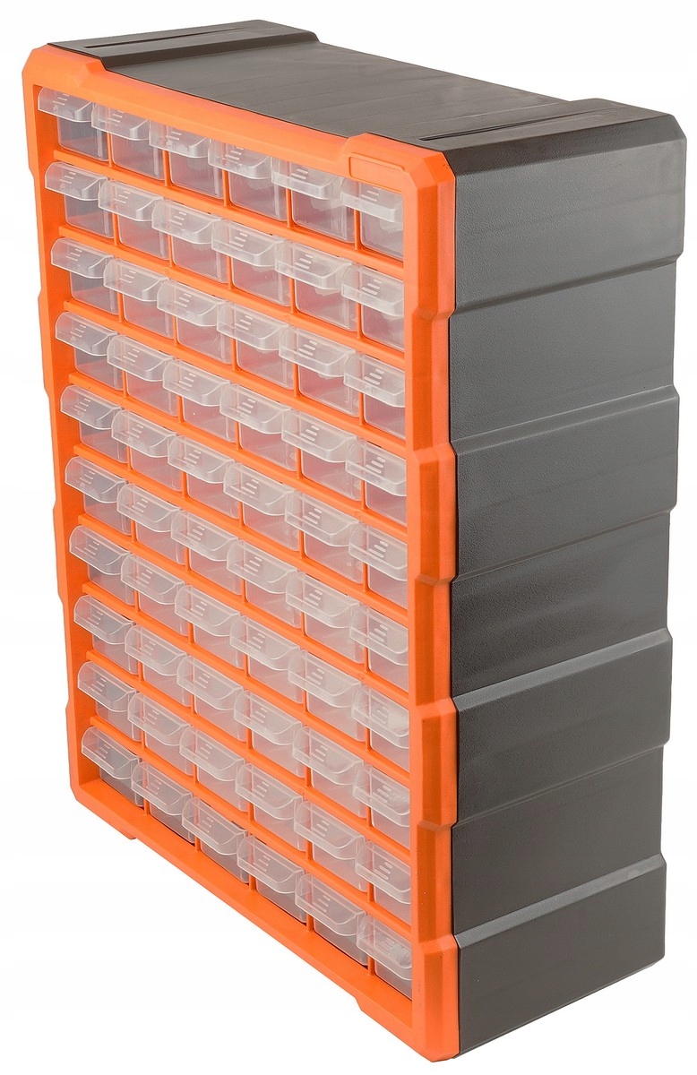 Organizer pionowy z 60 wysuwanymi, przezroczystymi szufladkami, każda wyposażona w przegrodę, idealny do przechowywania i transportu małych elementów takich jak śruby, nakrętki, okucia, akcesoria wędkarskie i inne drobiazgi. Solidna obudowa i możliwość montażu na ścianie zwiększają funkcjonalność i wygodę użytkowania.