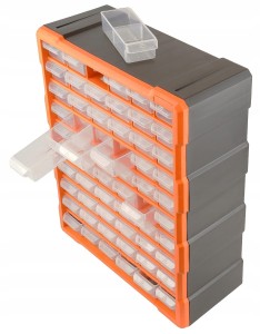 - Wysoka pojemność – aż 60 przezroczystych wysuwanych szufladek, każda z przegrodą, ułatwiają selekcję drobnych elementów.