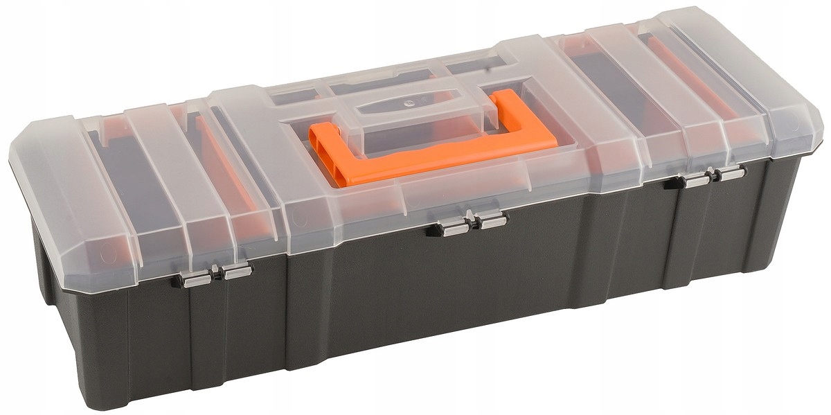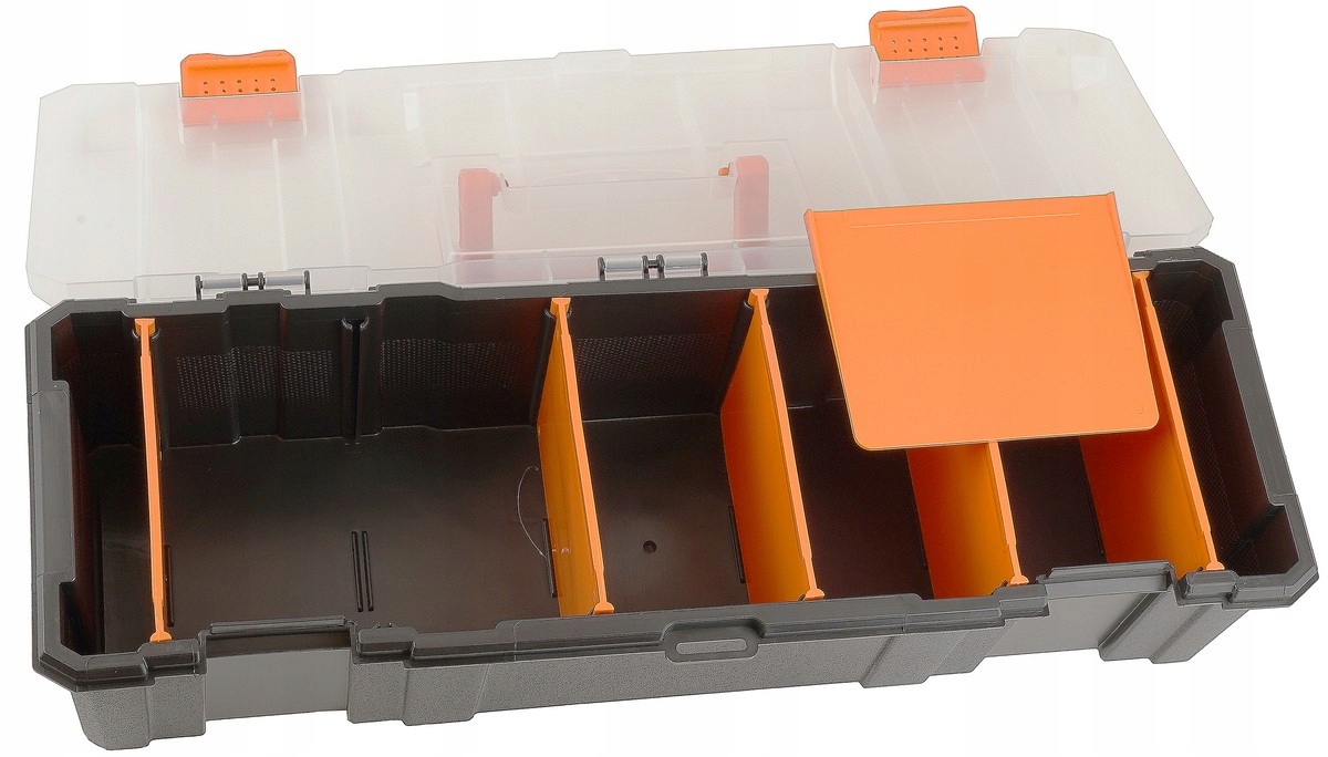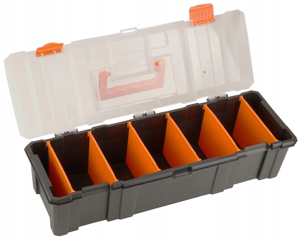 Organizer poziomy z siedmioma sekcjami i przestawnymi przegródkami, o wymiarach zewnętrznych 460×160×120 mm. Przeznaczony do przechowywania oraz transportu drobnych elementów takich jak śruby, nakrętki, wkręty, okucia, części zamienne, akcesoria wędkarskie czy niewielkie narzędzia. Dzięki mocnej obudowie oraz wygodnej rączce zapewnia trwałość i mobilność w codziennym użytkowaniu.