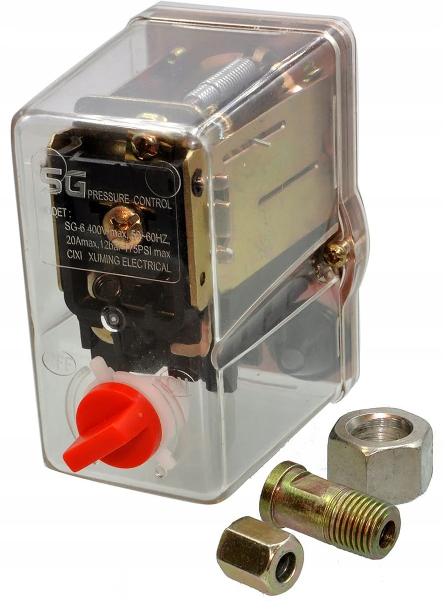 Presostat przeznaczony do automatycznego sterowania sprężarką zasilaną napięciem 400 V. Włącza i wyłącza kompresor w zależności od ustawionego ciśnienia roboczego. Montowany w kompresorach warsztatowych i przemysłowych, zapewnia bezpieczną i wydajną pracę instalacji pneumatycznej.