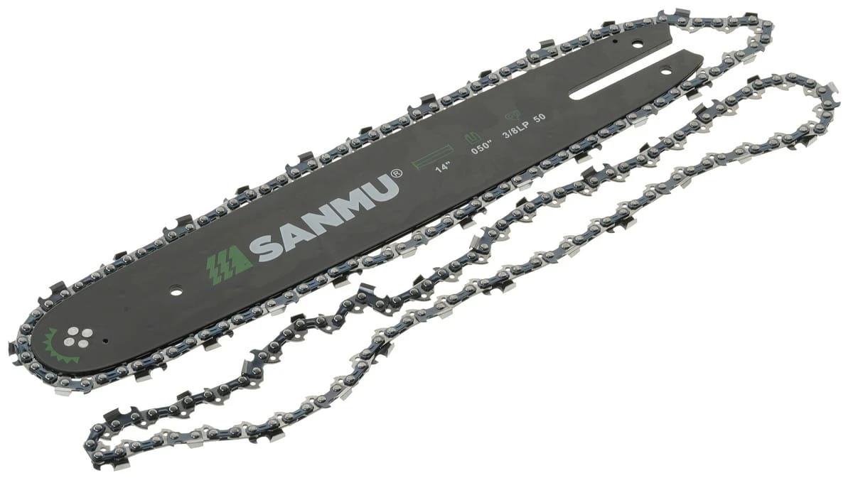 Kompletny zestaw tnący SANMU składa się z trwałej prowadnicy 14" (35 cm) oraz precyzyjnego łańcucha SuperZąb. Zestaw zapewnia szybkie, czyste i stabilne cięcie drewna, idealny do prac ogrodowych, przydomowych oraz lekkich zastosowań profesjonalnych.