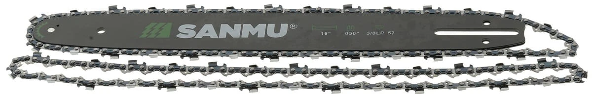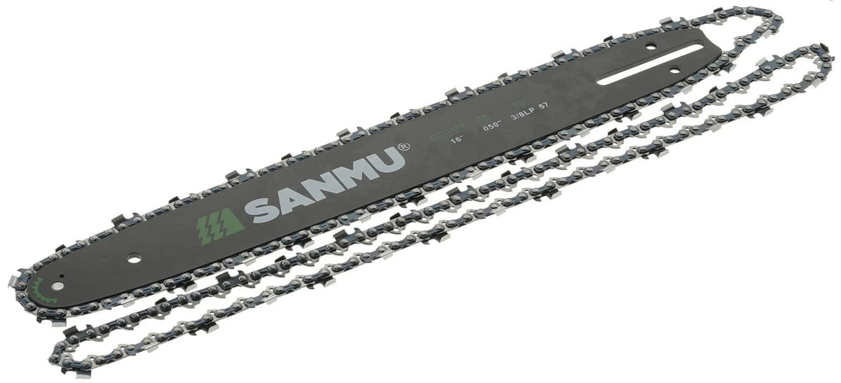 Kompletny zestaw tnący SANMU, w skład którego wchodzi trwała prowadnica 16” (40 cm) oraz wysokiej jakości łańcuch SuperZąb. Zestaw przeznaczony do precyzyjnego i szybkiego cięcia drewna w warunkach domowych i profesjonalnych.