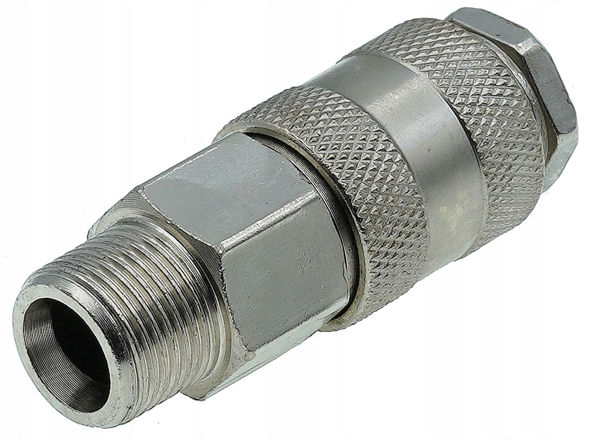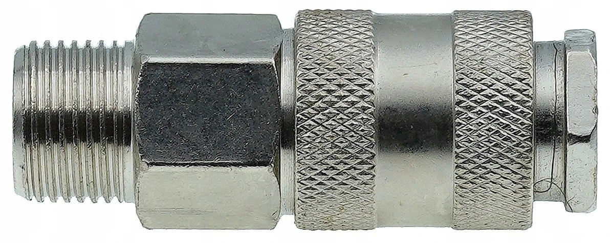 Przejściówka do sprężarki powietrza z zewnętrznym gwintem 3/8″. Używana do łączenia wężyków i narzędzi pneumatycznych ze złączkami typu EURO. Idealna do wymiany lub naprawy standardowych instalacji powietrznych.