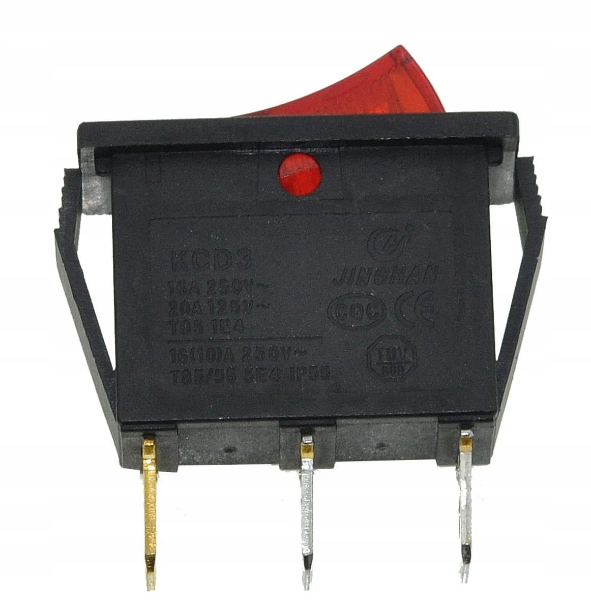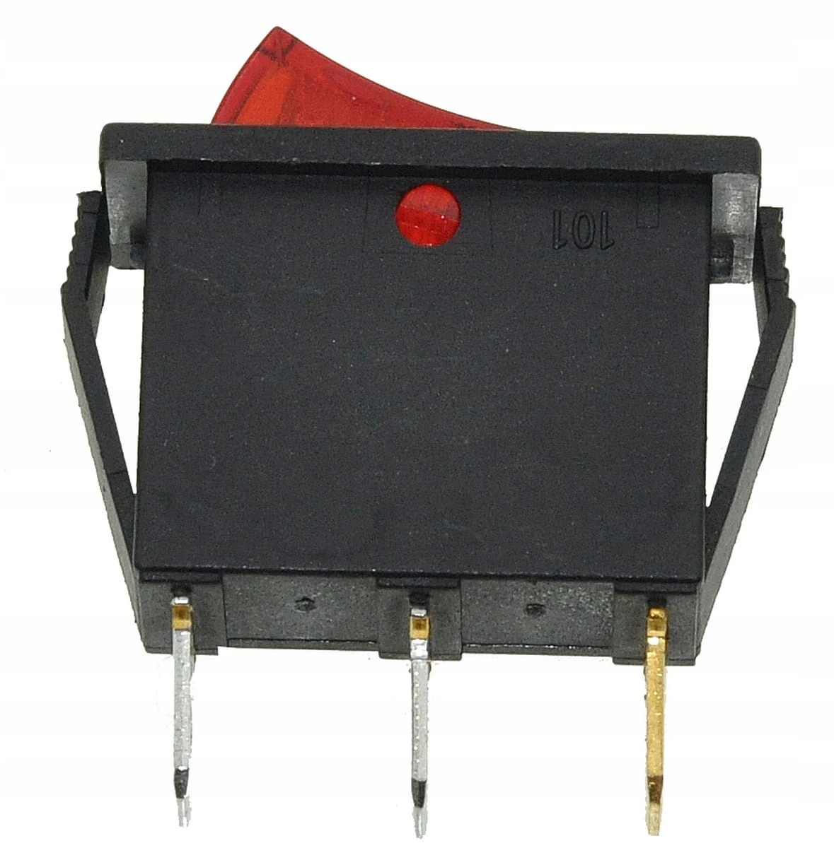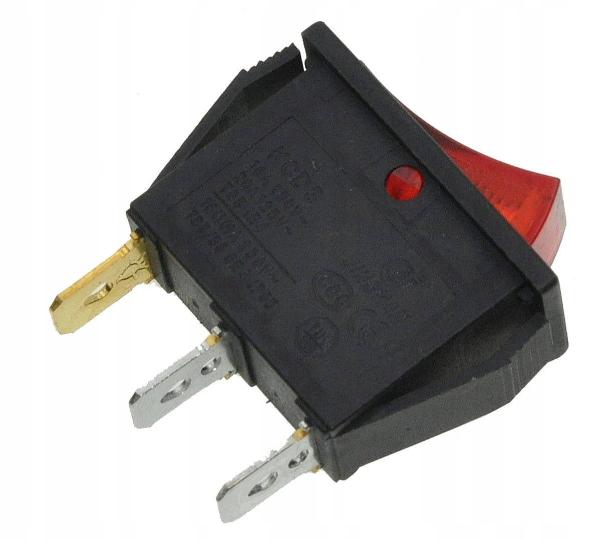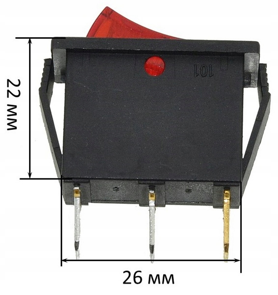 Przełącznik (tumbler) dwupozycyjny z trzema styki i wbudowanym podświetleniem LED. Klawisz ma wymiary 14 mm szerokości i 30 mm długości. Podstawa urządzenia mierzy 26 mm długości i 22 mm wysokości. Przełącznik przeznaczony do pracy przy prądzie do 16 A, idealny do zastosowań, gdzie wymagane jest trwałe i wyraźne sterowanie w warunkach słabego oświetlenia.
