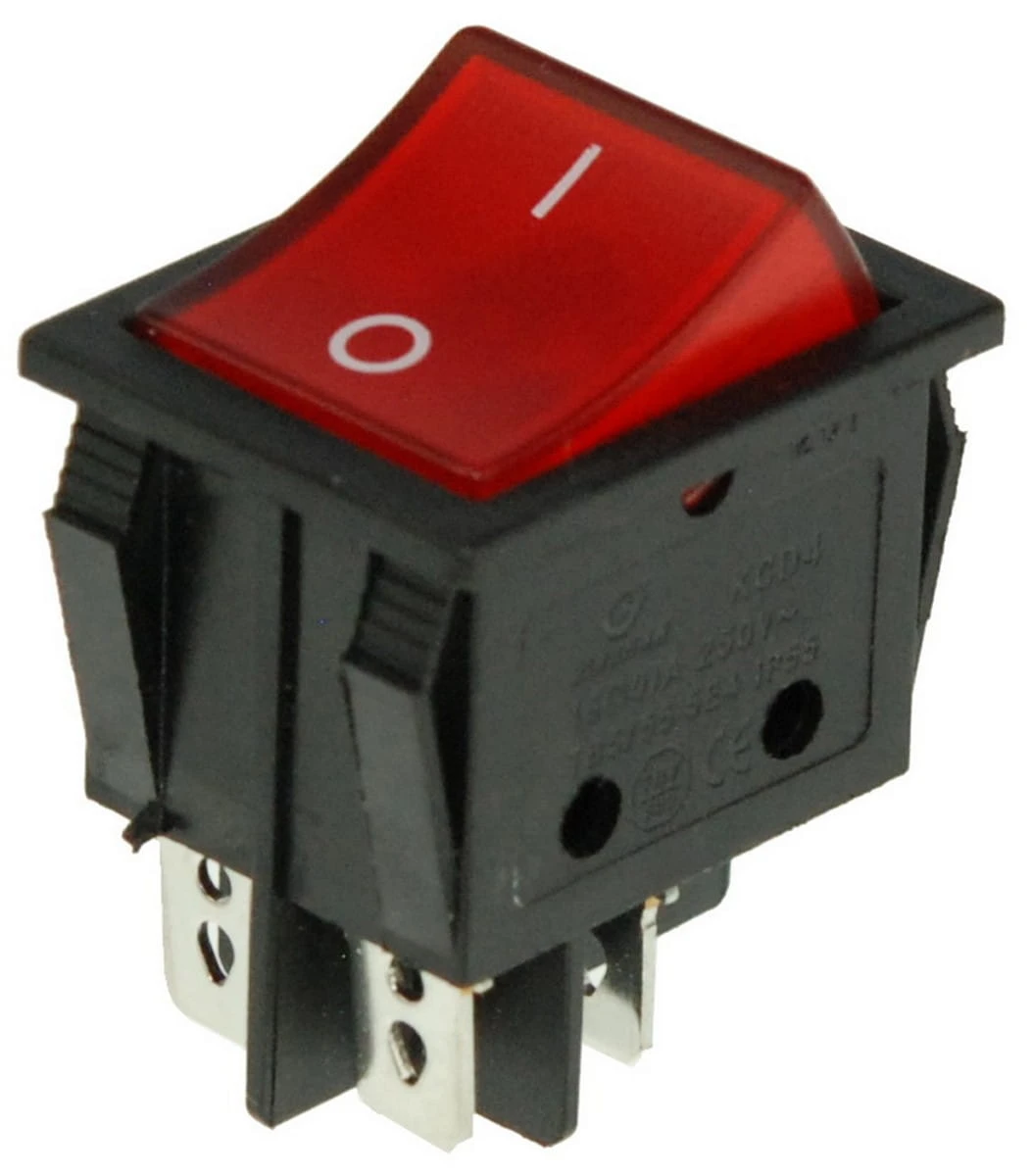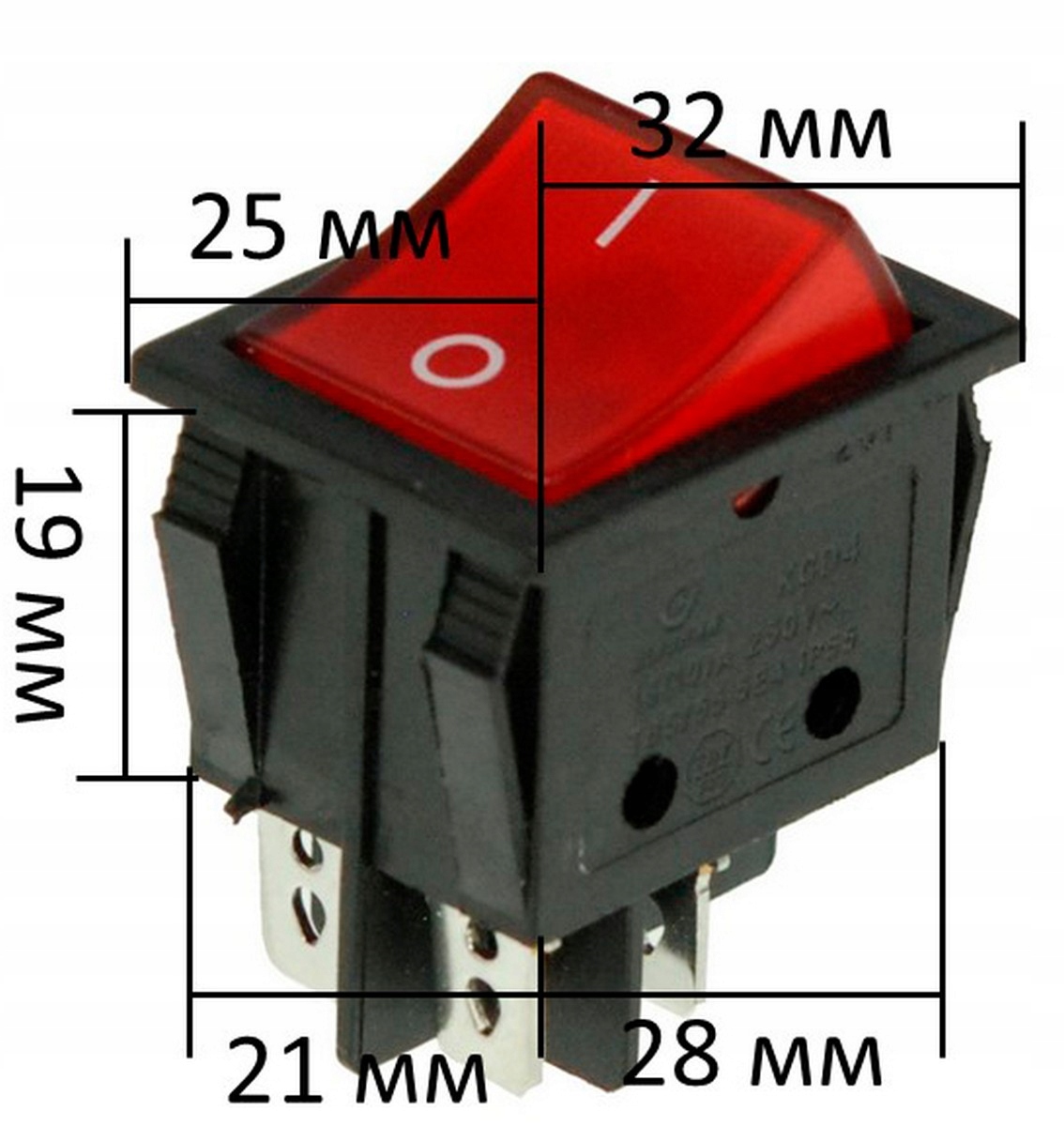 Przełącznik (tumbler) dwupozycyjny z czterema stykami i wbudowanym podświetleniem LED. Klawisz ma szerokość 25 mm i długość 32 mm. Podstawa urządzenia ma szerokość 21 mm, długość 28 mm i wysokość 31 mm. Urządzenie przeznaczone jest do pracy przy prądzie do 16 A, idealne do montażu w panelach sterujących i urządzeniach wymagających jasnej sygnalizacji działania.