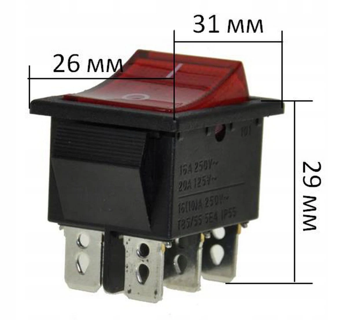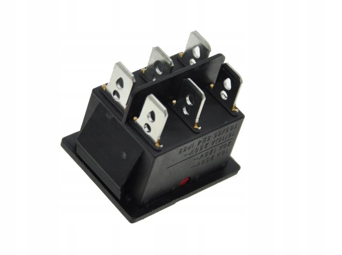 Przełącznik (tumbler) dwupozycyjny z sześcioma stykami i wbudowanym LED. Klawisz ma wymiary 26 mm szerokości i 31 mm długości. Wysokość podstawy urządzenia wynosi 29 mm. Ten model przełącznika zaprojektowany jest do pracy przy prądzie do 16 A, idealny jako element sterowania w panelach czy urządzeniach elektrycznych, gdzie wymagana jest wyraźna sygnalizacja stanu i niezawodność działania.
